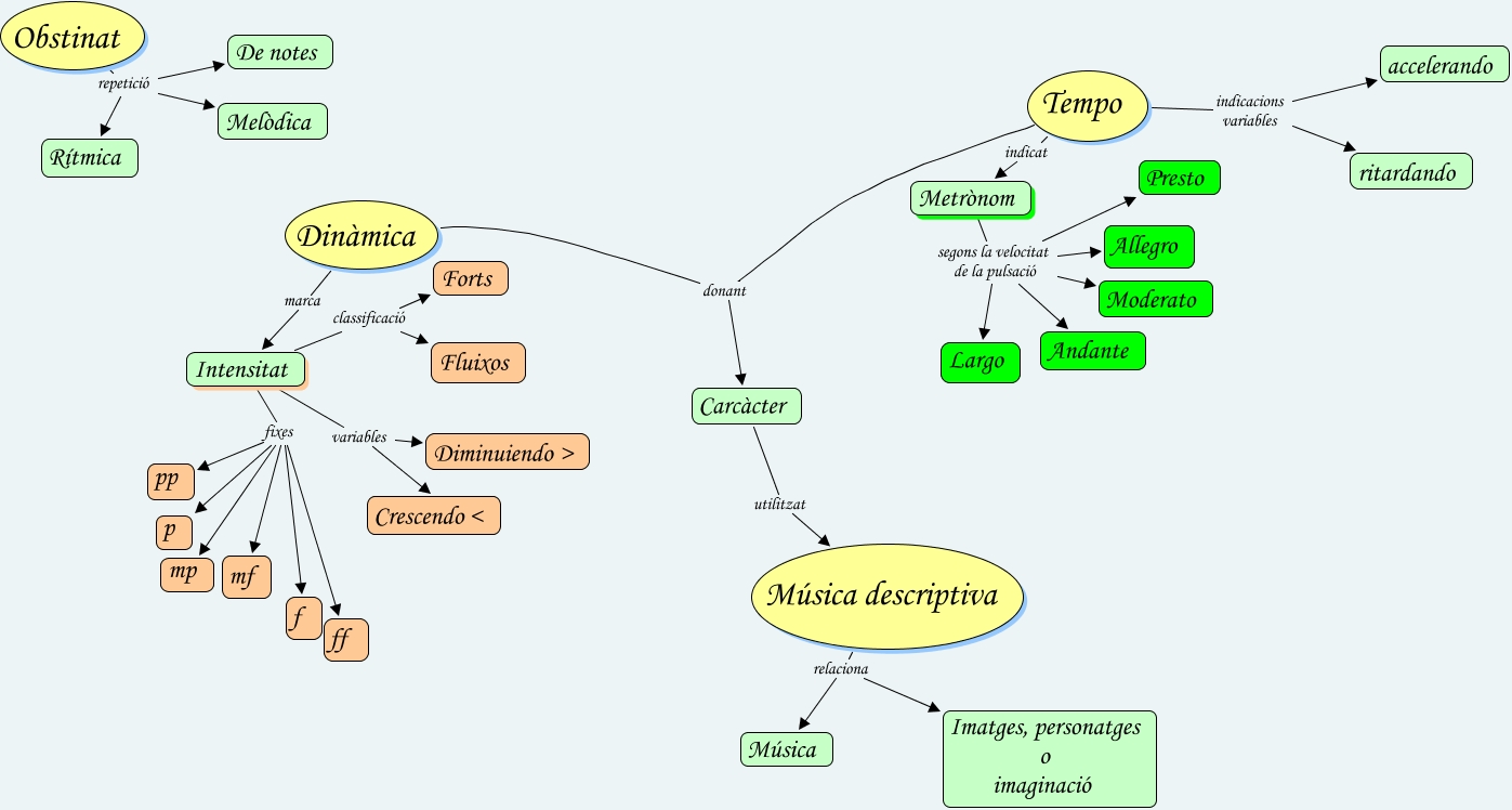 Este Cmap, tiene información relacionada con: T3 primer 09-10, Intensitat classificació Forts, Intensitat fixes p, Intensitat variables Diminuiendo >, Tempo indicat Metrònom, Tempo indicacions variables ritardando, Metrònom segons la velocitat de la pulsació Moderato, Obstinat repetició De notes, Dinàmica donant Tempo, Intensitat fixes mf, Metrònom segons la velocitat de la pulsació Allegro, Música descriptiva relaciona Música, Dinàmica marca Intensitat, Tempo indicacions variables accelerando, Intensitat fixes pp, Intensitat variables Crescendo <, Intensitat fixes ff, Obstinat repetició Rítmica, Obstinat repetició Melòdica, Intensitat fixes f, Intensitat classificació Fluixos
