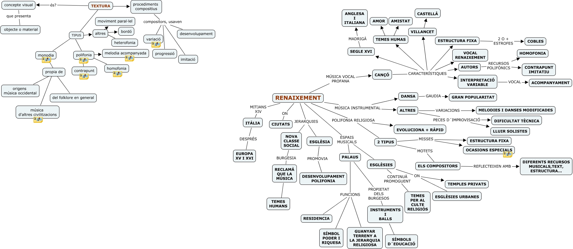 Este Cmap, tiene información relacionada con: textures i renaixement, polifonia ???? melodia acompanyada, RECLAMÀ QUE LA MÚSICA ???? TEMES HUMANS, CANÇÓ CARACTERÍSTIQUES SEGLE XVI, TEMES HUMAS ???? AMOR, CANÇÓ CARACTERÍSTIQUES VILLANCET, NOVA CLASSE SOCIAL BURGESIA RECLAMÀ QUE LA MÚSICA, CANÇÓ CARACTERÍSTIQUES VOCAL RENAIXEMENT, procediments compositius compositors, usaven progressió, 2 TIPUS MISSES ESTRUCTURA FIXA, procediments compositius compositors, usaven imitació, ALTRES PECES D´IMPROVISACIÓ LLUIR SOLISTES, polifonia ???? contrapunt, RENAIXEMENT POLIFONIA RELIGIOSA EVOLUCIONA + RÀPID, DANSA GAUDIA GRAN POPULARITAT, CANÇÓ CARACTERÍSTIQUES INTERPRETACIÓ VARIABLE, altres ???? bordó, PALAUS PROPIETAT DELS BURGESOS INSTRUMENTS I BALLS, TEXTURA és? concepte visual, TIPUS ???? altres, PALAUS FUNCIONS SÍMBOL PODER I RIQUESA