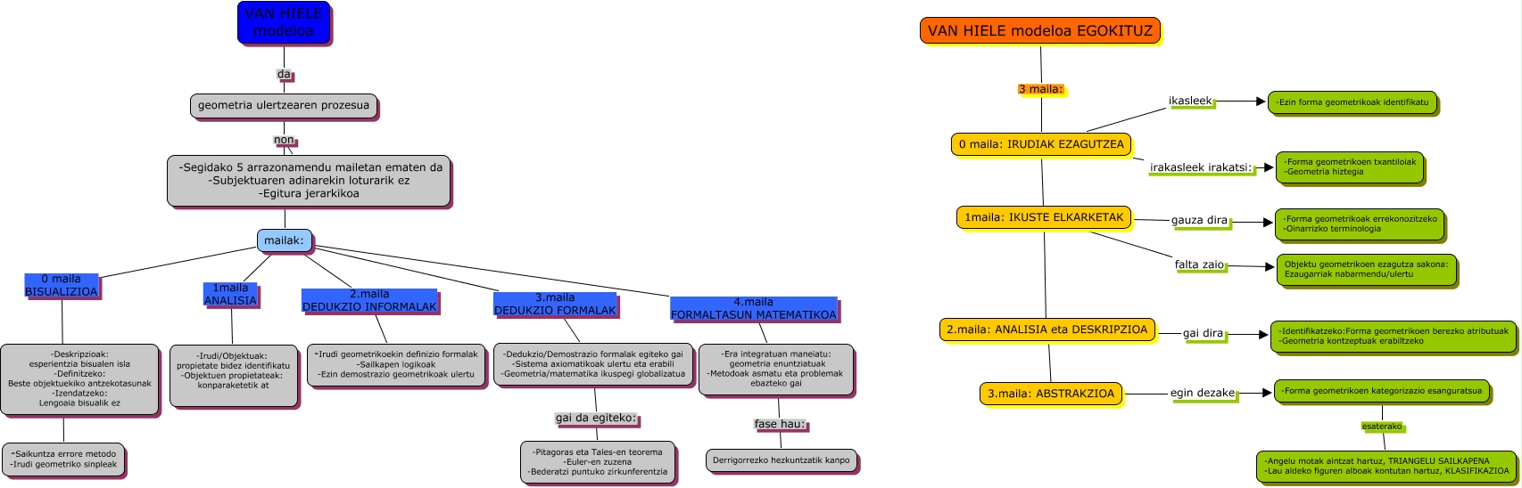 Este Cmap, tiene información relacionada con: Arregi Etxenagusia,Leire, mailak: 3.maila DEDUKZIO FORMALAK -Dedukzio/Demostrazio formalak egiteko gai -Sistema axiomatikoak ulertu eta erabili -Geometria/matematika ikuspegi globalizatua, VAN HIELE modeloa da geometria ulertzearen prozesua, 2.maila: ANALISIA eta DESKRIPZIOA gai dira -Identifikatzeko:Forma geometrikoen berezko atributuak -Geometria kontzeptuak erabiltzeko, geometria ulertzearen prozesua non -Segidako 5 arrazonamendu mailetan ematen da -Subjektuaren adinarekin loturarik ez -Egitura jerarkikoa, 1maila: IKUSTE ELKARKETAK gauza dira -Forma geometrikoak errekonozitzeko -Oinarrizko terminologia, mailak: 0 maila BISUALIZIOA -Saikuntza errore metodo -Irudi geometriko sinpleak, mailak: 2.maila DEDUKZIO INFORMALAK -Irudi geometrikoekin definizio formalak -Sailkapen logikoak -Ezin demostrazio geometrikoak ulertu, 1maila: IKUSTE ELKARKETAK falta zaio Objektu geometrikoen ezagutza sakona: Ezaugarriak nabarmendu/ulertu, -Forma geometrikoen kategorizazio esanguratsua esaterako -Angelu motak aintzat hartuz, TRIANGELU SAILKAPENA -Lau aldeko figuren alboak kontutan hartuz, KLASIFIKAZIOA, -Dedukzio/Demostrazio formalak egiteko gai -Sistema axiomatikoak ulertu eta erabili -Geometria/matematika ikuspegi globalizatua gai da egiteko: -Pitagoras eta Tales-en teorema -Euler-en zuzena -Bederatzi puntuko zirkunferentzia, 3.maila: ABSTRAKZIOA egin dezake -Forma geometrikoen kategorizazio esanguratsua, 0 maila: IRUDIAK EZAGUTZEA irakasleek irakatsi: -Forma geometrikoen txantiloiak -Geometria hiztegia, geometria ulertzearen prozesua non mailak:, 2.maila: ANALISIA eta DESKRIPZIOA ???? 3.maila: ABSTRAKZIOA, mailak: 1maila ANALISIA -Irudi/Objektuak: propietate bidez identifikatu -Objektuen propietateak: konparaketetik at, mailak: 4.maila FORMALTASUN MATEMATIKOA -Era integratuan maneiatu: geometria enuntziatuak -Metodoak asmatu eta problemak ebazteko gai, 0 maila: IRUDIAK EZAGUTZEA ???? 1maila: IKUSTE ELKARKETAK, 1maila: IKUSTE ELKARKETAK ???? 2.maila: ANALISIA eta DESKRIPZIOA, 1maila: IKUSTE ELKARKETAK gauza dira -Forma geometrikoak errekonozitzeko -Oinarrizko terminologia, VAN HIELE modeloa EGOKITUZ 3 maila: 0 maila: IRUDIAK EZAGUTZEA