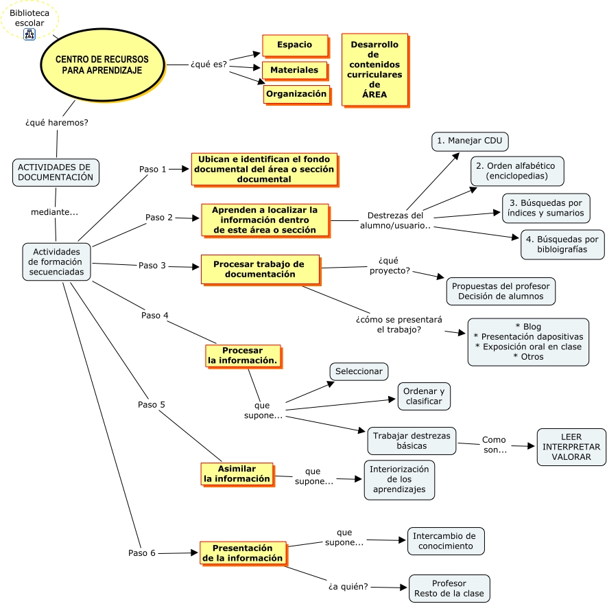 Este Cmap, tiene información relacionada con: RECURSOS, Trabajar destrezas básicas Como son... LEER INTERPRETAR VALORAR, Aprenden a localizar la información dentro de este área o sección Destrezas del alumno/usuario.. 4. Búsquedas por bibloigrafías, CENTRO DE RECURSOS PARA APRENDIZAJE ¿qué es? Espacio, Actividades de formación secuenciadas Paso 1 Ubican e identifican el fondo documental del área o sección documental, Aprenden a localizar la información dentro de este área o sección Destrezas del alumno/usuario.. 2. Orden alfabético (enciclopedias), Presentación de la información que supone... Intercambio de conocimiento, Biblioteca escolar ???? CENTRO DE RECURSOS PARA APRENDIZAJE, ACTIVIDADES DE DOCUMENTACIÓN mediante... Actividades de formación secuenciadas, Aprenden a localizar la información dentro de este área o sección Destrezas del alumno/usuario.. 1. Manejar CDU, Actividades de formación secuenciadas Paso 5 Asimilar la información, Actividades de formación secuenciadas Paso 2 Aprenden a localizar la información dentro de este área o sección, Procesar la información. que supone... Trabajar destrezas básicas, Procesar la información. que supone... Ordenar y clasificar, Actividades de formación secuenciadas Paso 4 Procesar la información., Actividades de formación secuenciadas Paso 6 Presentación de la información, Procesar la información. que supone... Seleccionar, Presentación de la información ¿a quién? Profesor Resto de la clase, Aprenden a localizar la información dentro de este área o sección Destrezas del alumno/usuario.. 3. Búsquedas por índices y sumarios, Actividades de formación secuenciadas Paso 3 Procesar trabajo de documentación, Asimilar la información que supone... Interiorización de los aprendizajes