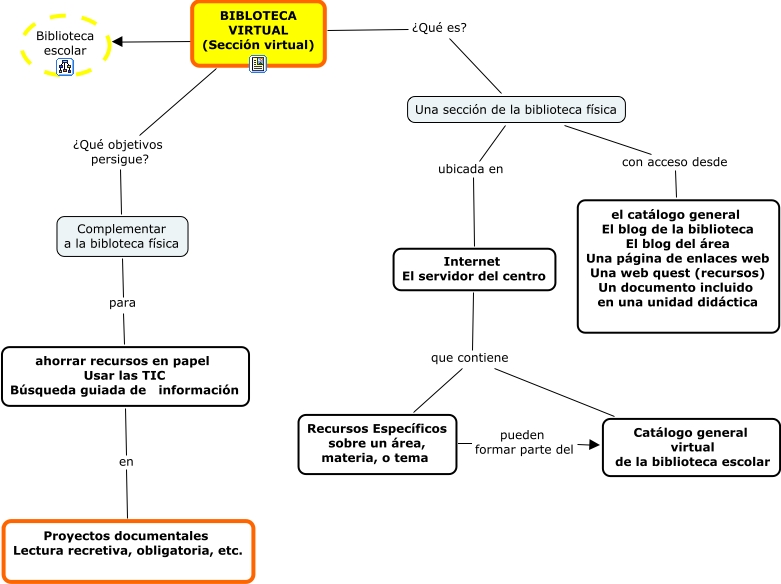 Este Cmap, tiene información relacionada con: bib virtual, Internet El servidor del centro que contiene Recursos Específicos sobre un área, materia, o tema, Una sección de la biblioteca física con acceso desde el catálogo general El blog de la biblioteca El blog del área Una página de enlaces web Una web quest (recursos) Un documento incluido en una unidad didáctica, Recursos Específicos sobre un área, materia, o tema pueden formar parte del Catálogo general virtual de la biblioteca escolar, ahorrar recursos en papel Usar las TIC Búsqueda guiada de información en Proyectos documentales Lectura recretiva, obligatoria, etc., Una sección de la biblioteca física ubicada en Internet El servidor del centro, BIBLOTECA VIRTUAL (Sección virtual) ¿Qué es? Una sección de la biblioteca física, BIBLOTECA VIRTUAL (Sección virtual) ¿Qué objetivos persigue? Complementar a la bibloteca física, BIBLOTECA VIRTUAL (Sección virtual) Biblioteca escolar, Internet El servidor del centro que contiene Catálogo general virtual de la biblioteca escolar, Complementar a la bibloteca física para ahorrar recursos en papel Usar las TIC Búsqueda guiada de información
