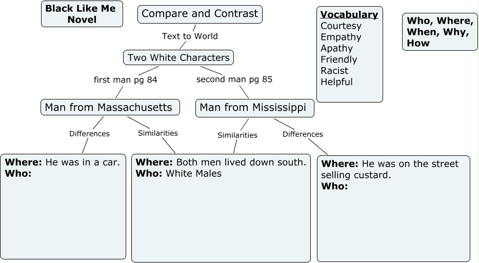 This Concept Map, created with IHMC CmapTools, has information related to: Compare and Contrast, Two White Characters first man pg 84 Man from Massachusetts, Man from Mississippi Similarities Where: Both men lived down south. Who: White Males, Two White Characters second man pg 85 Man from Mississippi, Compare and Contrast Text to World Two White Characters, Man from Massachusetts Similarities Where: Both men lived down south. Who: White Males, Man from Massachusetts Differences Where: He was in a car. Who:, Man from Mississippi Differences Where: He was on the street selling custard. Who: