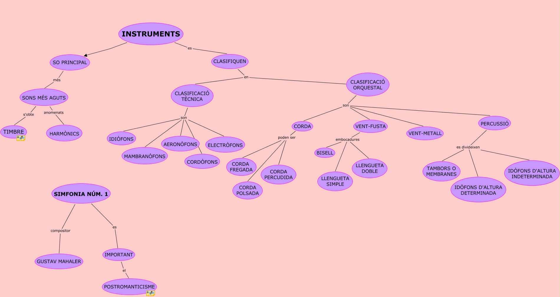 Este Cmap, tiene información relacionada con: T-4, PERCUSSIÓ es divideixen IDÒFONS D'ALTURA INDETERMINADA, CORDA poden ser CORDA FREGADA, CLASIFIQUEN en CLASIFICACIÓ ORQUESTAL, VENT-FUSTA embocadures BISELL, CLASIFICACIÓ ORQUESTAL son VENT-METALL, VENT-FUSTA embocadures LLENGUETA DOBLE, CLASIFICACIÓ ORQUESTAL son CORDA, INSTRUMENTS SO PRINCIPAL, CLASIFICACIÓ TÈCNICA son CORDÒFONS, CORDA poden ser CORDA PERCUDIDA, VENT-FUSTA embocadures LLENGUETA SIMPLE, CLASIFICACIÓ TÈCNICA son MAMBRANÒFONS, SIMFONIA NÚM. 1 compositor GUSTAV MAHALER, PERCUSSIÓ es divideixen TAMBORS O MEMBRANES, CLASIFICACIÓ TÈCNICA son ELECTRÒFONS, CLASIFICACIÓ ORQUESTAL son PERCUSSIÓ, SONS MÉS AGUTS anomenats HARMÒNICS, CLASIFICACIÓ TÈCNICA son AERONÒFONS, CORDA poden ser CORDA POLSADA, IMPORTANT el POSTROMANTICISME