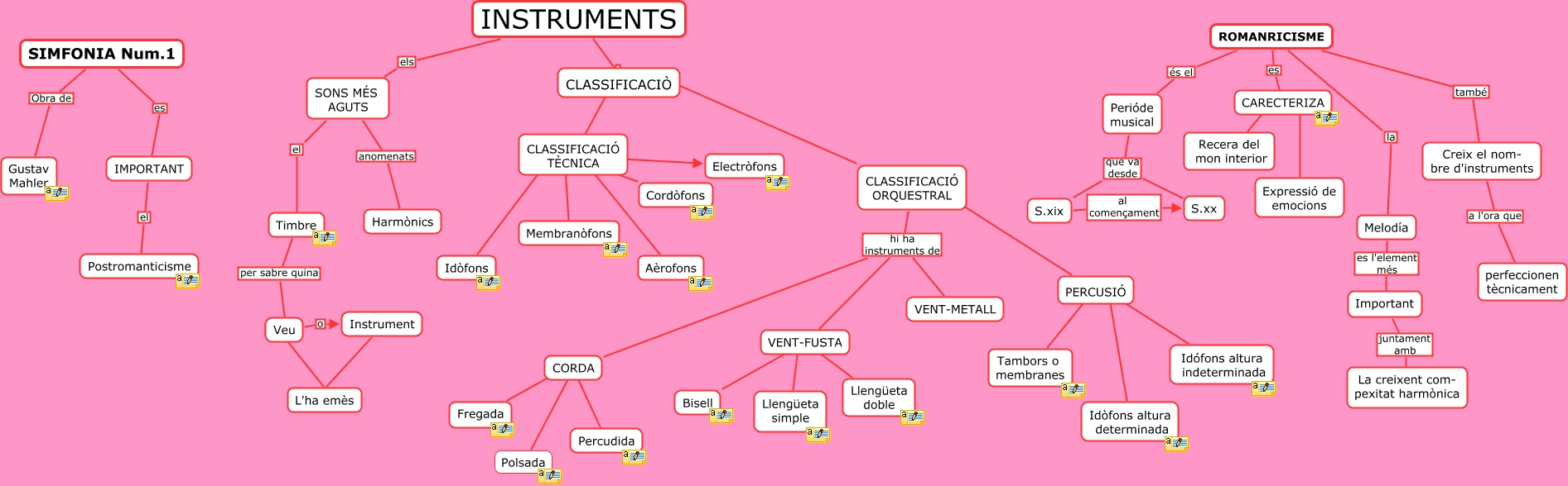 Este Cmap, tiene información relacionada con: Unitat - 4 (Instruments), PERCUSIÓ ???? Tambors o membranes, IMPORTANT el Postromanticisme, VENT-FUSTA ???? Llengüeta simple, Melodía es l'element més Important, ROMANRICISME també Creix el nom- bre d'instruments, PERCUSIÓ ???? Idòfons altura determinada, CORDA ???? Fregada, Creix el nom- bre d'instruments a l'ora que perfeccionen tècnicament, SONS MÉS AGUTS anomenats Harmònics, VENT-FUSTA ???? Bisell, CORDA ???? Percudida, S.xix al començament S.xx, SIMFONIA Num.1 es IMPORTANT, CLASSIFICACIÓ TÈCNICA ???? Electròfons, CARECTERIZA ???? Recera del mon interior, CARECTERIZA ???? Expressió de emocions, Instrument ???? L'ha emès, Perióde musical que va desde S.xix, CLASSIFICACIÓ TÈCNICA ???? Membranòfons, Veu o Instrument