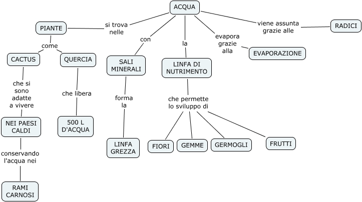 Questa Cmap, creata con IHMC CmapTools, contiene informazioni relative a: ACQUA NELLE PIANTE, NEI PAESI CALDI conservando l'acqua nei RAMI CARNOSI, PIANTE come CACTUS, CACTUS che si sono adatte a vivere NEI PAESI CALDI, ACQUA viene assunta grazie alle RADICI, LINFA DI NUTRIMENTO che permette lo sviluppo di FRUTTI, ACQUA evapora grazie alla EVAPORAZIONE, ACQUA si trova nelle PIANTE, LINFA DI NUTRIMENTO che permette lo sviluppo di FIORI, ACQUA con SALI MINERALI, PIANTE come QUERCIA, ACQUA la LINFA DI NUTRIMENTO, LINFA DI NUTRIMENTO che permette lo sviluppo di GERMOGLI, LINFA DI NUTRIMENTO che permette lo sviluppo di GEMME, SALI MINERALI forma la LINFA GREZZA, QUERCIA che libera 500 L D'ACQUA