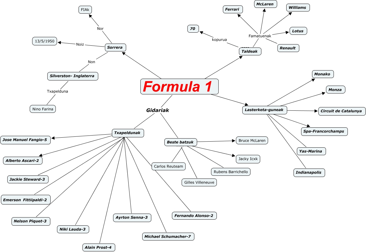 Este Cmap, tiene información relacionada con: Formula 1, Taldeak Famatuenak Ferrari, Beste batzuk ???? Carlos Reuteam, Taldeak Famatuenak McLaren, Lasterketa-guneak ???? Monako, Txapeldunak ???? Ayrton Senna-3, Formula 1 ???? Lasterketa-guneak, Txapeldunak ???? Alberto Ascari-2, Txapeldunak ???? Fernando Alonso-2, Taldeak Famatuenak Lotus, Lasterketa-guneak ???? Spa-Francorchamps, Txapeldunak ???? Jackie Steward-3, Sorrera Noiz 13/5/1950, Beste batzuk ???? Jacky Icxk, Formula 1 Gidariak Txapeldunak, Silverston- Inglaterra Txapelduna Nino Farina, Txapeldunak ???? Niki Lauda-3, Taldeak Famatuenak Renault, Txapeldunak ???? Emerson Fittiipaldi-2, Sorrera Non Silverston- Inglaterra, Txapeldunak ???? Alain Prost-4
