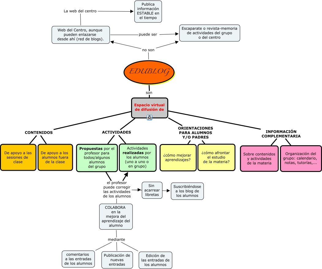 Este Cmap, tiene información relacionada con: EDUBLOG2, Propuestas por el profesor para todos/algunos alumnos del grupo el profesor puede corregir las actividades de los alumnos Actividades realizadas por los alumnos (uno a uno o en grupo), Espacio virtual de difusión de ORIENTACIONES PARA ALUMNOS Y/O PADRES ¿cómo afrontar el estudio de la materia?, Espacio virtual de difusión de ACTIVIDADES Actividades realizadas por los alumnos (uno a uno o en grupo), Espacio virtual de difusión de ORIENTACIONES PARA ALUMNOS Y/O PADRES ¿cómo mejorar aprendizajes?, Espacio virtual de difusión de INFORMACIÓN COMPLEMENTARIA Sobre contenidos y actividades de la materia, EDUBLOG no son Escaparate o revista-memoria de actividades del grupo o del centro, COLABORA en la mejora del aprendizaje del alumno mediante comentarios a las entradas de los alumnos, Propuestas por el profesor para todos/algunos alumnos del grupo el profesor puede corregir las actividades de los alumnos COLABORA en la mejora del aprendizaje del alumno, Espacio virtual de difusión de CONTENIDOS De apoyo a los alumnos fuera de la clase, Web del Centro, aunque pueden enlazarse desde ahí (red de blogs). puede ser Escaparate o revista-memoria de actividades del grupo o del centro, COLABORA en la mejora del aprendizaje del alumno mediante Edición de las entradas de los alumnos, EDUBLOG no son Web del Centro, aunque pueden enlazarse desde ahí (red de blogs)., Web del Centro, aunque pueden enlazarse desde ahí (red de blogs). La web del centro Publica información ESTABLE en el tiempo, COLABORA en la mejora del aprendizaje del alumno mediante Publicación de nuevas entradas, Propuestas por el profesor para todos/algunos alumnos del grupo el profesor puede corregir las actividades de los alumnos Suscribiéndose a los blog de los alumnos, Espacio virtual de difusión de INFORMACIÓN COMPLEMENTARIA Organización del grupo: calendario, notas, tutorías,..., Espacio virtual de difusión de CONTENIDOS De apoyo a las sesiones de clase, EDUBLOG son Espacio virtual de difusión de, Espacio virtual de difusión de ACTIVIDADES Propuestas por el profesor para todos/algunos alumnos del grupo, Propuestas por el profesor para todos/algunos alumnos del grupo el profesor puede corregir las actividades de los alumnos Sin acarrear libretas