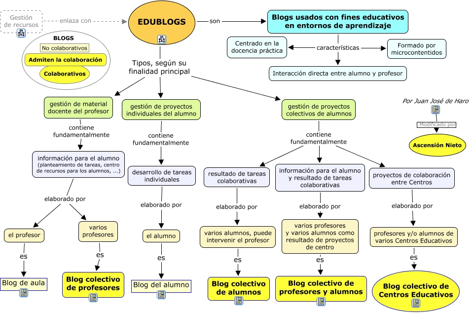 Este Cmap, tiene información relacionada con: uso de los blogs, resultado de tareas colaborativas elaborado por varios alumnos, puede intervenir el profesor, gestión de proyectos colectivos de alumnos contiene fundamentalmente proyectos de colaboración entre Centros, el profesor es Blog de aula, desarrollo de tareas individuales elaborado por el alumno, varios alumnos, puede intervenir el profesor es Blog colectivo de alumnos, varios profesores y varios alumnos como resultado de proyectos de centro es Blog colectivo de profesores y alumnos, Gestión de recursos enlaza con EDUBLOGS, información para el alumno y resultado de tareas colaborativas elaborado por varios profesores y varios alumnos como resultado de proyectos de centro, información para el alumno (planteamiento de tareas, centro de recursos para los alumnos, ...) elaborado por el profesor, gestión de proyectos individuales del alumno contiene fundamentalmente desarrollo de tareas individuales, Blogs usados con fines educativos en entornos de aprendizaje características Centrado en la docencia práctica, EDUBLOGS Tipos, según su finalidad principal gestión de proyectos individuales del alumno, gestión de proyectos colectivos de alumnos contiene fundamentalmente resultado de tareas colaborativas, proyectos de colaboración entre Centros elaborado por profesores y/o alumnos de varios Centros Educativos, información para el alumno (planteamiento de tareas, centro de recursos para los alumnos, ...) elaborado por varios profesores, EDUBLOGS Tipos, según su finalidad principal gestión de material docente del profesor, gestión de material docente del profesor contiene fundamentalmente información para el alumno (planteamiento de tareas, centro de recursos para los alumnos, ...), EDUBLOGS Tipos, según su finalidad principal gestión de proyectos colectivos de alumnos, EDUBLOGS son Blogs usados con fines educativos en entornos de aprendizaje, el alumno es Blog del alumno