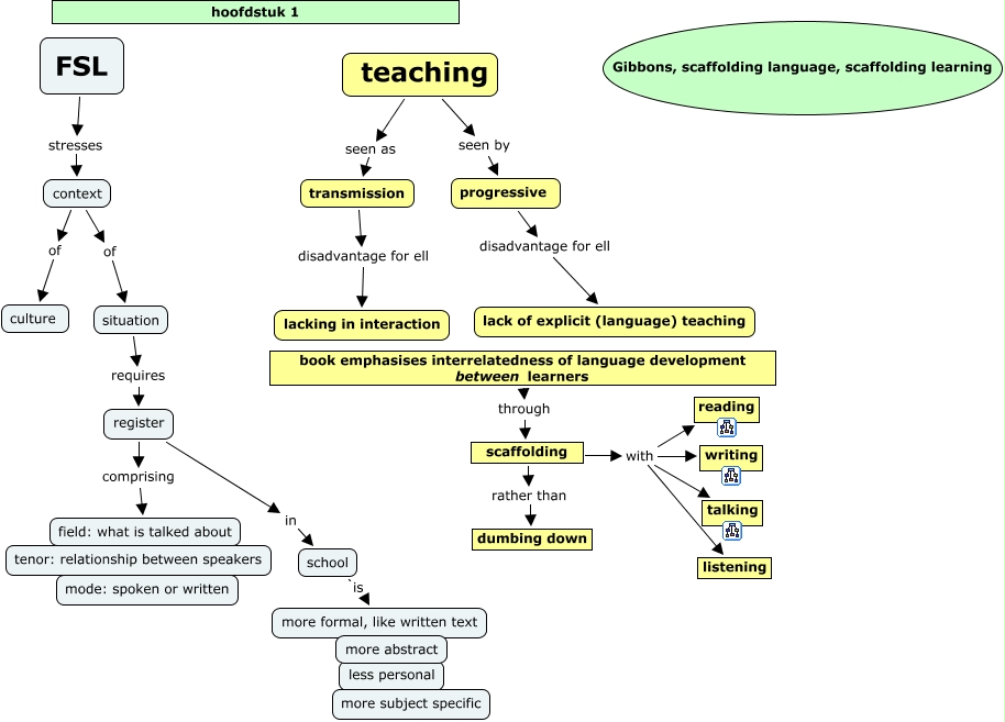 Deze Concept Map heeft informatie gerelateerd aan: START gibbons scaffolding language.cmap, context of culture, register in school, context of situation, scaffolding with writing, teaching seen as transmission, scaffolding with listening, register comprising field: what is talked about, situation requires register, book emphasises interrelatedness of language development between learners through scaffolding, school is more formal, like written text, FSL stresses context, teaching seen by progressive, scaffolding with talking, scaffolding rather than dumbing down, transmission disadvantage for ell lacking in interaction, progressive disadvantage for ell lack of explicit (language) teaching, scaffolding with reading
