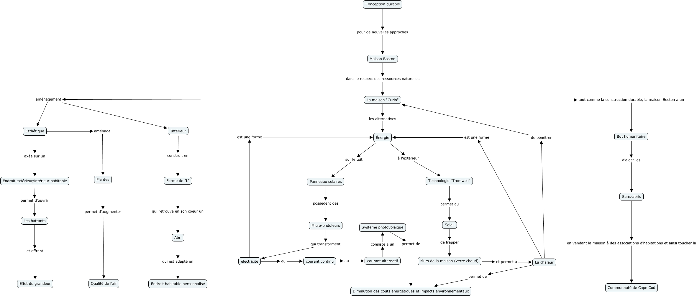 Cette carte de concepts créée avec IHMC CmapTools traite de: Carte conceptuelle TP1 individue Maison Boston par Julie Brabant, Esthétique aménage Plantes, Forme de "L" qui retrouve en son coeur un Abri, La maison "Curio" les alternatives Énergie, Intérieur construit en Forme de "L", Murs de la maison (verre chaud) et permet à La chaleur, Maison Boston dans le respect des ressources naturelles La maison "Curio", Micro-onduleurs qui transforment électricité, Soleil de frapper Murs de la maison (verre chaud), courant continu au courant alternatif, Les battants et offrent Effet de grandeur, Conception durable pour de nouvelles approches Maison Boston, Plantes permet d'augmenter Qualité de l'air, électricité du courant continu, Énergie à l'extérieur Technologie "Tromwell", Esthétique axée sur un Endroit extérieur/intérieur habitable, La chaleur est une forme Énergie, But humanitaire d'aider les Sans-abris, Technologie "Tromwell" permet au Soleil, courant alternatif consiste a un Systeme photovolaique, Abri qui est adapté en Endroit habitable personnalisé