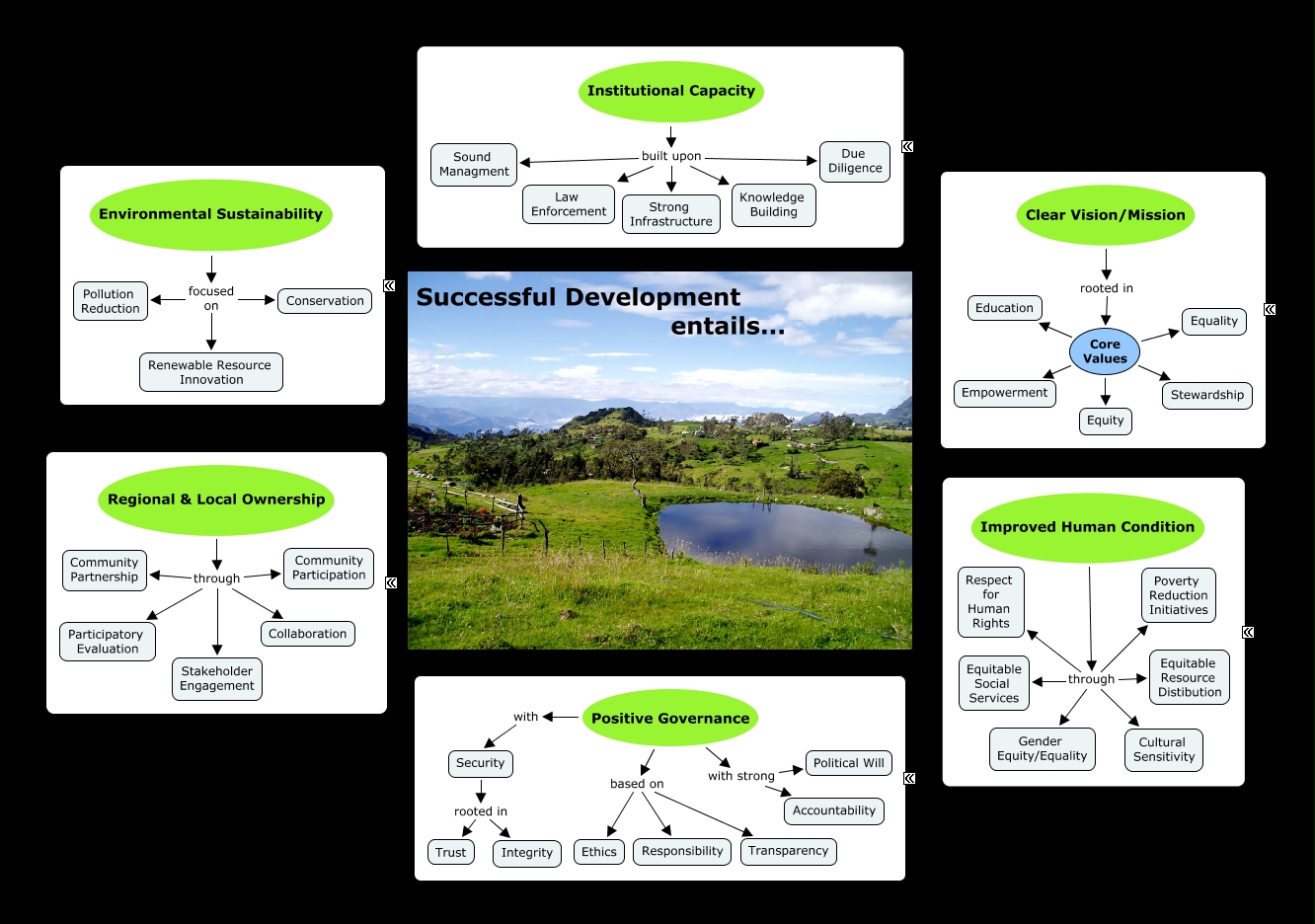 This Concept Map, created with IHMC CmapTools, has information related to: Josh's Development Philosophy, Institutional Capacity built upon Sound Managment, Security rooted in Integrity, Improved Human Condition through Cultural Sensitivity, Improved Human Condition through Respect for Human Rights, Institutional Capacity built upon Strong Infrastructure, Core Values Stewardship, Positive Governance with strong Political Will, Environmental Sustainability focused on Pollution Reduction, Improved Human Condition through Equitable Social Services, Regional & Local Ownership through Community Partnership, Environmental Sustainability focused on Renewable Resource Innovation, Institutional Capacity built upon Law Enforcement, Positive Governance based on Transparency, Regional & Local Ownership through Stakeholder Engagement, Improved Human Condition through Gender Equity/Equality, Institutional Capacity built upon Due Diligence, Security rooted in Trust, Regional & Local Ownership through Collaboration, Clear Vision/Mission rooted in Core Values, Core Values Empowerment