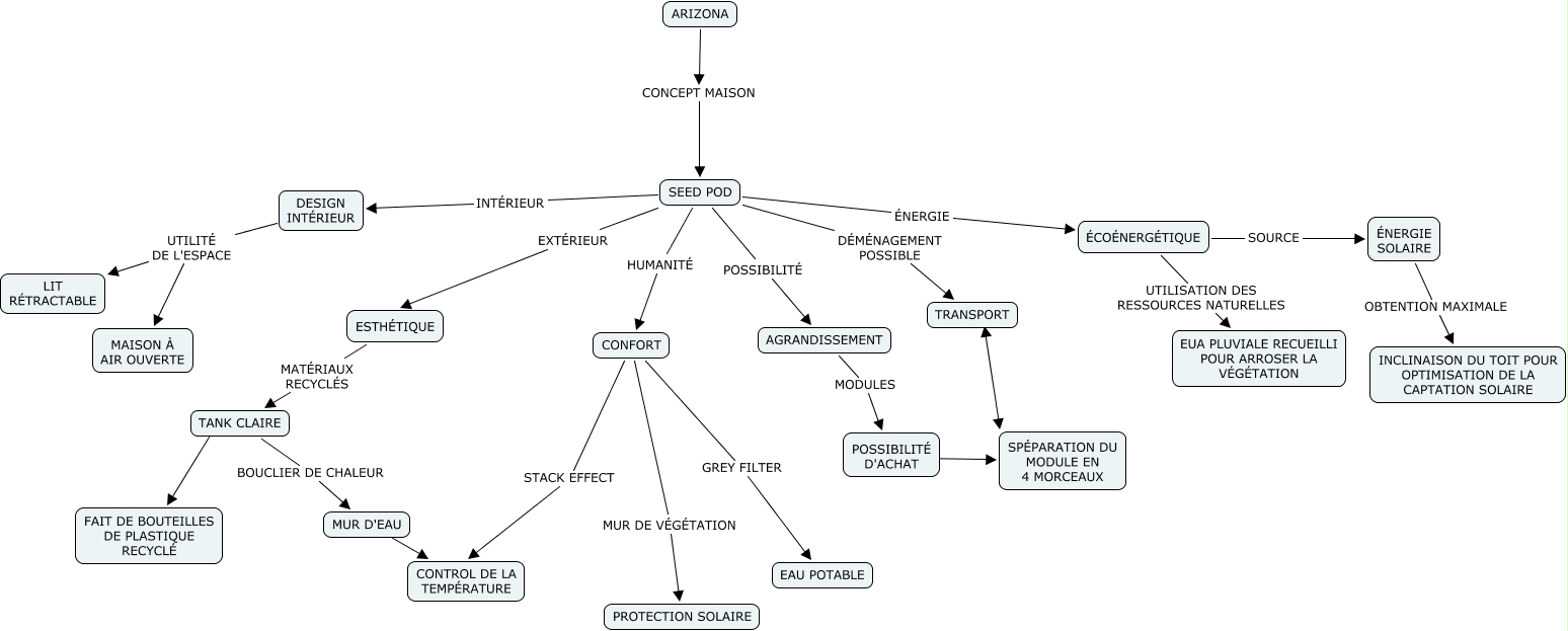Cette carte de concepts créée avec IHMC CmapTools traite de: Patrick Ziccardi CTN735, ARIZONA CONCEPT MAISON SEED POD, TANK CLAIRE ???? FAIT DE BOUTEILLES DE PLASTIQUE RECYCLÉ, DESIGN INTÉRIEUR UTILITÉ DE L'ESPACE MAISON À AIR OUVERTE, TANK CLAIRE BOUCLIER DE CHALEUR MUR D'EAU, POSSIBILITÉ D'ACHAT ???? SPÉPARATION DU MODULE EN 4 MORCEAUX, ÉNERGIE SOLAIRE OBTENTION MAXIMALE INCLINAISON DU TOIT POUR OPTIMISATION DE LA CAPTATION SOLAIRE, AGRANDISSEMENT MODULES POSSIBILITÉ D'ACHAT, ESTHÉTIQUE MATÉRIAUX RECYCLÉS TANK CLAIRE, CONFORT GREY FILTER EAU POTABLE, SEED POD EXTÉRIEUR ESTHÉTIQUE, CONFORT MUR DE VÉGÉTATION PROTECTION SOLAIRE, SEED POD INTÉRIEUR DESIGN INTÉRIEUR, DESIGN INTÉRIEUR UTILITÉ DE L'ESPACE LIT RÉTRACTABLE, ÉCOÉNERGÉTIQUE SOURCE ÉNERGIE SOLAIRE, ÉCOÉNERGÉTIQUE UTILISATION DES RESSOURCES NATURELLES EUA PLUVIALE RECUEILLI POUR ARROSER LA VÉGÉTATION, MUR D'EAU ???? CONTROL DE LA TEMPÉRATURE, TRANSPORT ???? SPÉPARATION DU MODULE EN 4 MORCEAUX, SEED POD ÉNERGIE ÉCOÉNERGÉTIQUE, SEED POD DÉMÉNAGEMENT POSSIBLE TRANSPORT, CONFORT STACK EFFECT CONTROL DE LA TEMPÉRATURE