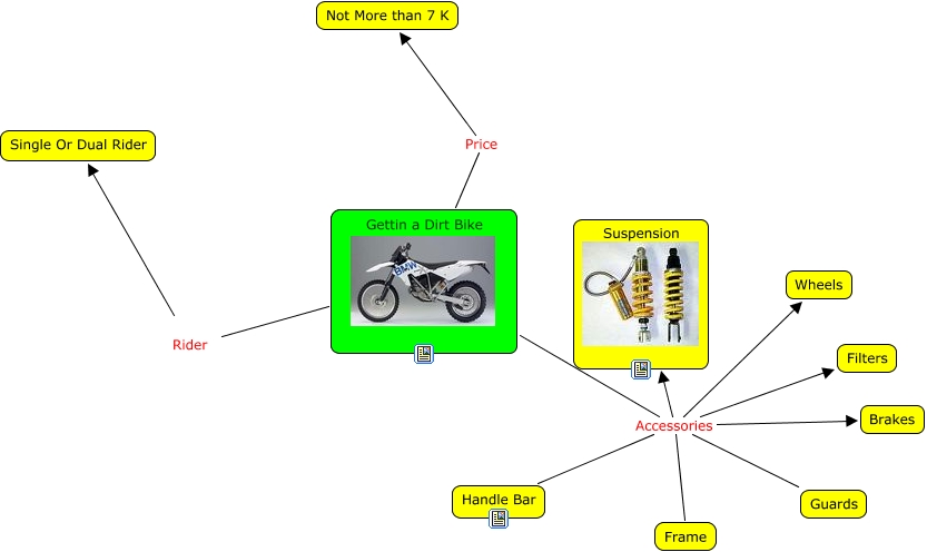 This Concept Map, created with IHMC CmapTools, has information related to: Getting a dirt bike, Gettin a Dirt Bike Accessories Frame, Gettin a Dirt Bike Accessories Brakes, Gettin a Dirt Bike Accessories Wheels, Gettin a Dirt Bike Accessories Filters, Gettin a Dirt Bike Accessories Guards, Gettin a Dirt Bike Rider Single Or Dual Rider, Gettin a Dirt Bike Accessories Handle Bar, Gettin a Dirt Bike Accessories Suspension, Gettin a Dirt Bike Price Not More than 7 K