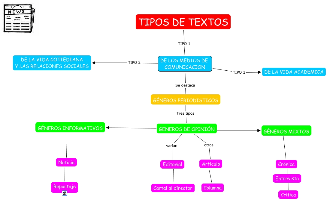 Este Cmap, tiene información relacionada con: Lengua, GENEROS DE OPINIÓN ???? GÉNEROS MIXTOS, TIPOS DE TEXTOS TIPO 1 DE LOS MEDIOS DE COMUNICACION, GÉNEROS PERIODISTICOS Tres tipos GENEROS DE OPINIÓN, DE LOS MEDIOS DE COMUNICACION Se destaca GÉNEROS PERIODISTICOS, Crónica ???? Entrevista, GENEROS DE OPINIÓN ???? GÉNEROS INFORMATIVOS, GENEROS DE OPINIÓN otros Artículo, GÉNEROS INFORMATIVOS ???? Noticia, Artículo ???? Columna, GÉNEROS MIXTOS ???? Crónica, DE LOS MEDIOS DE COMUNICACION TIPO 3 DE LA VIDA ACADEMICA, DE LOS MEDIOS DE COMUNICACION TIPO 2 DE LA VIDA COTIEDIANA Y LAS RELACIONES SOCIALES, GENEROS DE OPINIÓN varían Editorial, Editorial ???? Cartal al director, Noticia ???? Reportaje, Entrevista ???? Crítica