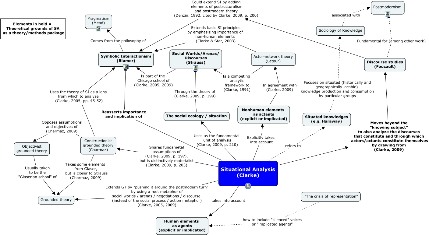 Dieses mit IHMC CmapTools erstellte CMap hat Informationen bezüglich: SituationalAnalysis, Actor-network theory (Latour) Is a competing analytic framework to (Clarke, 1991) Social Worlds/Arenas/ Discourses (Strauss), Symbolic Interactionism (Blumer) Comes from the philosophy of Pragmatism (Mead), Discourse studies (Foucault) Could extend SI by adding elements of postructuralism and postmodern theory (Denzin, 1992, cited by Clarke, 2009, p. 200) Symbolic Interactionism (Blumer), Situational Analysis (Clarke) Shares fundametal assumptions of (Clarke, 2009, p. 197), but is distinctively materialist (Clarke, 2009, p. 203) Constructionist grounded theory (Charmaz), "The crisis of representation" how to include "silenced" voices or "implicated agents" Human elements as agents (explicit or implicated), Situational Analysis (Clarke) Reasserts importance and implication of Symbolic Interactionism (Blumer), Constructionist grounded theory (Charmaz) Opposes assumptions and objectives of (Charmaz, 2009) Objectivist grounded theory, Nonhuman elements as actants (explicit or implicated) In agreement with (Clarke, 2009) Actor-network theory (Latour), Situational Analysis (Clarke) Moves beyond the "knowing subject" to also analyze the discourses that constitute and through which actors/actants constitute themselves by drawing from (Clarke, 2009) Discourse studies (Foucault), Situational Analysis (Clarke) takes into account Human elements as agents (explicit or implicated), Discourse studies (Foucault) Fundamental for (among other work) Postmodernism, The social ecology / situation Through the theory of (Clarke, 2009, p. 199) Social Worlds/Arenas/ Discourses (Strauss), Actor-network theory (Latour) Extends basic SI principles by emphasizing importance of non-human elements (Clarke & Star, 2003) Symbolic Interactionism (Blumer), Social Worlds/Arenas/ Discourses (Strauss) Is part of the Chicago school of (Clarke, 2005, 2009) Symbolic Interactionism (Blumer), Sociology of Knowledge associated with Postmodernism, Situated knowledges (e.g. Haraway) Focuses on situated (historically and geographically locable) knowledge production and consumption by particular groups Sociology of Knowledge, Situational Analysis (Clarke) refers to Situated knowledges (e.g. Haraway), Situational Analysis (Clarke) Uses as the fundamental unit of analysis (Clarke, 2009, p. 210) The social ecology / situation, Situational Analysis (Clarke) Extends GT by "pushing it around the postmodern turn" by using a root metaphor of social worlds / arenas / negotiations / discourse (instead of the social process / action metaphor) (Clarke, 2005, 2009) Grounded theory, Situational Analysis (Clarke) Explicitly takes into account Nonhuman elements as actants (explicit or implicated)