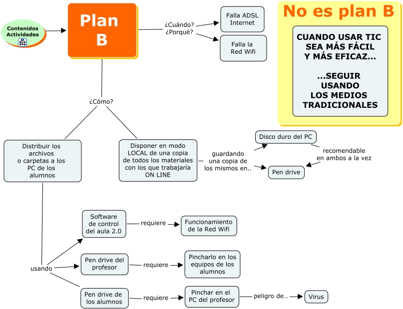 Este Cmap, tiene información relacionada con: Plan B, Contenidos Actividades ???? Plan B, Distribuir los archivos o carpetas a los PC de los alumnos usando Software de control del aula 2.0, Software de control del aula 2.0 requiere Funcionamiento de la Red Wifi, Distribuir los archivos o carpetas a los PC de los alumnos usando Pen drive del profesor, Disco duro del PC recomendable en ambos a la vez Pen drive, Plan B ¿Cómo? Distribuir los archivos o carpetas a los PC de los alumnos, Plan B ¿Cómo? Disponer en modo LOCAL de una copia de todos los materiales con los que trabajaría ON LINE, Disponer en modo LOCAL de una copia de todos los materiales con los que trabajaría ON LINE guardando una copia de los mismos en.. Disco duro del PC, Plan B ¿Cuándo? ¿Porqué? Falla la Red Wifi, Pen drive del profesor requiere Pincharlo en los equipos de los alumnos, Distribuir los archivos o carpetas a los PC de los alumnos usando Pen drive de los alumnos, Plan B ¿Cuándo? ¿Porqué? Falla ADSL Internet, Disponer en modo LOCAL de una copia de todos los materiales con los que trabajaría ON LINE guardando una copia de los mismos en.. Pen drive, Pinchar en el PC del profesor peligro de.. Virus, Pen drive de los alumnos requiere Pinchar en el PC del profesor