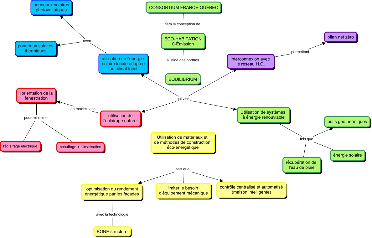 Cette carte de concepts créée avec IHMC CmapTools traite de: Éco-habitation 0-émission, l'orientation de la fenestration pour minimiser l'éclairage électrique, Utilisation de matériaux et de méthodes de construction éco-énergétique tels que contrôle centralisé et automatisé (maison intelligente), ÉQUILIBRIUM qui vise Utilisation de matériaux et de méthodes de construction éco-énergétique, Utilisation de systèmes à énergie renouvlable tels que puits géothermiques, Utilisation de matériaux et de méthodes de construction éco-énergétique tels que limiter le besoin d'équipement mécanique, Utilisation de systèmes à énergie renouvlable tels que récupération de l'eau de pluie, Utilisation de matériaux et de méthodes de construction éco-énergétique tels que l'optimisation du rendement énergétique par les façades, utilisation de l'éclairage naturel en maximisant l'orientation de la fenestration, CONSORTIUM FRANCE-QUÉBEC fera la conception de ÉCO-HABITATION 0-Émission, utilisation de l'énergie solaire locale adaptée au climat local avec panneaux solaires photovoltaïques, ÉQUILIBRIUM qui vise utilisation de l'éclairage naturel, ÉQUILIBRIUM qui vise Interconnexion avec le réseau H.Q., l'orientation de la fenestration pour minimiser chauffage + climatisation, l'optimisation du rendement énergétique par les façades avec la technologie BONE structure, ÉCO-HABITATION 0-Émission a l'aide des normes ÉQUILIBRIUM, ÉQUILIBRIUM qui vise utilisation de l'énergie solaire locale adaptée au climat local, Interconnexion avec le réseau H.Q. permettant bilan net zéro, utilisation de l'énergie solaire locale adaptée au climat local avec panneaux solaires thermiques, Utilisation de systèmes à énergie renouvlable tels que énergie solaire, ÉQUILIBRIUM qui vise Utilisation de systèmes à énergie renouvlable