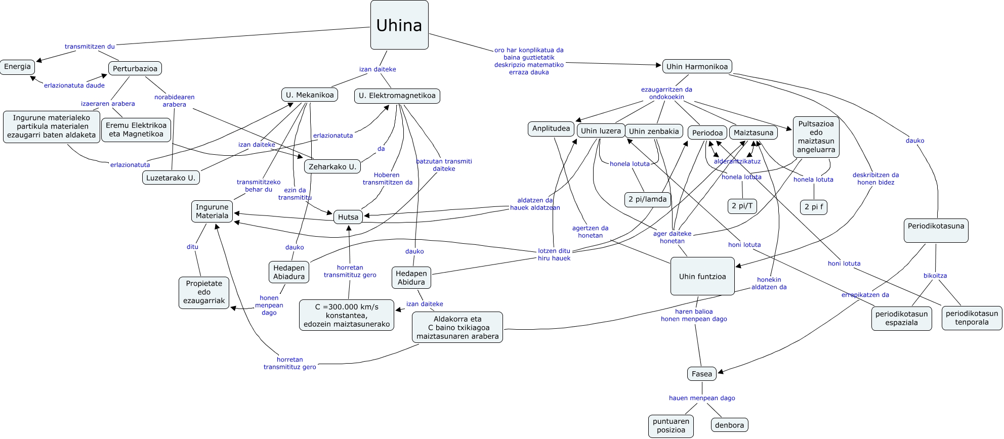 Este Cmap, tiene información relacionada con: Uhinak, Uhin Harmonikoa ezaugarritzen da ondokoekin Uhin zenbakia, Ingurune Materiala ditu Propietate edo ezaugarriak, Aldakorra eta C baino txikiagoa maiztasunaren arabera horretan transmitituz gero Ingurune Materiala, Uhin luzera ager daiteke honetan Uhin funtzioa, Uhina izan daiteke U. Elektromagnetikoa, U. Elektromagnetikoa dauko Hedapen Abidura, Uhina oro har konplikatua da baina guztietatik deskripzio matematiko erraza dauka Uhin Harmonikoa, Uhina transmititzen du Energia, Aldakorra eta C baino txikiagoa maiztasunaren arabera honekin aldatzen da Maiztasuna, periodikotasun espaziala honi lotuta Uhin luzera, U. Mekanikoa ezin da transmititu Hutsa, Pultsazioa edo maiztasun angeluarra honela lotuta 2 pi/T, Periodoa alderantzikatuz Maiztasuna, Uhin luzera aldatzen da hauek aldatzean Hutsa, U. Mekanikoa izan daiteke Luzetarako U., Uhin Harmonikoa deskribitzen da honen bidez Uhin funtzioa, Uhin Harmonikoa ezaugarritzen da ondokoekin Maiztasuna, U. Elektromagnetikoa da Zeharkako U., Uhin luzera aldatzen da hauek aldatzean Ingurune Materiala, Uhin Harmonikoa ezaugarritzen da ondokoekin Pultsazioa edo maiztasun angeluarra