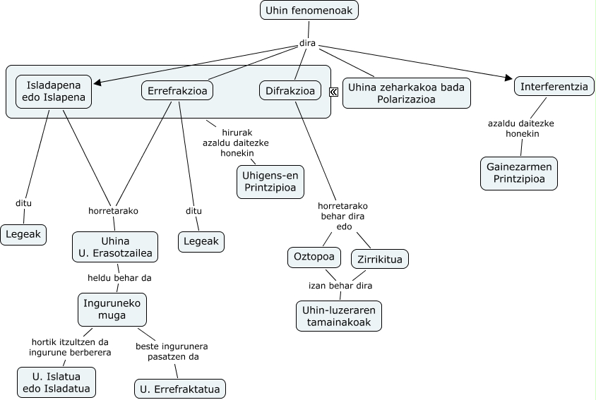 Este Cmap, tiene información relacionada con: Sin Título 1, Zirrikitua izan behar dira Uhin-luzeraren tamainakoak, ???? hirurak azaldu daitezke honekin Uhigens-en Printzipioa, Inguruneko muga beste ingurunera pasatzen da U. Errefraktatua, Difrakzioa horretarako behar dira edo Zirrikitua, Oztopoa izan behar dira Uhin-luzeraren tamainakoak, Uhin fenomenoak dira Difrakzioa, Uhina U. Erasotzailea heldu behar da Inguruneko muga, Isladapena edo Islapena horretarako Uhina U. Erasotzailea, Inguruneko muga hortik itzultzen da ingurune berberera U. Islatua edo Isladatua, Difrakzioa horretarako behar dira edo Oztopoa, Uhin fenomenoak dira Isladapena edo Islapena, Uhin fenomenoak dira Interferentzia, Isladapena edo Islapena ditu Legeak, Errefrakzioa ditu Legeak, Errefrakzioa horretarako Uhina U. Erasotzailea, Uhin fenomenoak dira Uhina zeharkakoa bada Polarizazioa, Interferentzia azaldu daitezke honekin Gainezarmen Printzipioa, Uhin fenomenoak dira Errefrakzioa