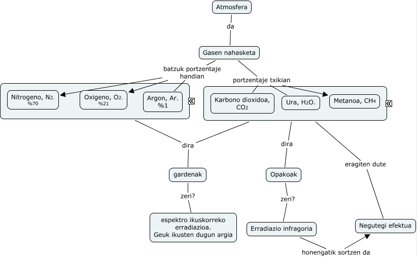Este Cmap, tiene información relacionada con: Atmosfrea, ???? dira gardenak, ???? dira gardenak, Gasen nahasketa portzentaje txikian Karbono dioxidoa, CO2, Atmosfera da Gasen nahasketa, Opakoak zeri? Erradiazio infragoria, gardenak zeri? espektro ikuskorreko erradiazioa. Geuk ikusten dugun argia, Gasen nahasketa batzuk portzentaje handian Nitrogeno, N2. %70, ???? dira Opakoak, Erradiazio infragoria honengatik sortzen da Negutegi efektua, Gasen nahasketa batzuk portzentaje handian Argon, Ar. %1, Gasen nahasketa portzentaje txikian Metanoa, CH4, ???? eragiten dute Negutegi efektua, Gasen nahasketa portzentaje txikian Ura, H2O., Gasen nahasketa batzuk portzentaje handian Oxigeno, O2. %21