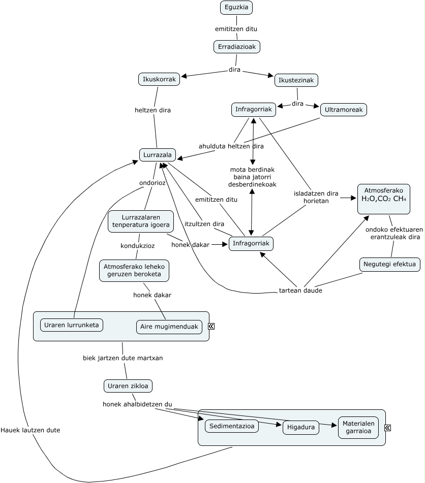 Este Cmap, tiene información relacionada con: eguzkiaHigadurarenMotorra, Eguzkia emititzen ditu Erradiazioak, Infragorriak isladatzen dira horietan Atmosferako H2O,CO2 CH4, Negutegi efektua tartean daude Atmosferako H2O,CO2 CH4, Ultramoreak ahulduta heltzen dira Lurrazala, Erradiazioak dira Ikustezinak, Lurrazalaren tenperatura igoera honek dakar Infragorriak, Infragorriak mota berdinak baina jatorri desberdinekoak Infragorriak, Infragorriak isladatzen dira horietan Atmosferako H2O,CO2 CH4, Negutegi efektua tartean daude Infragorriak, Lurrazalaren tenperatura igoera kondukzioz Atmosferako leheko geruzen beroketa, Uraren zikloa honek ahalbidetzen du Sedimentazioa, Lurrazala emititzen ditu Infragorriak, Negutegi efektua tartean daude Lurrazala, Ikustezinak dira Infragorriak, Atmosferako leheko geruzen beroketa honek dakar Aire mugimenduak, Erradiazioak dira Ikuskorrak, Uraren zikloa honek ahalbidetzen du Higadura, Infragorriak ahulduta heltzen dira Lurrazala, ???? Hauek lautzen dute Lurrazala, Infragorriak itzultzen dira Lurrazala