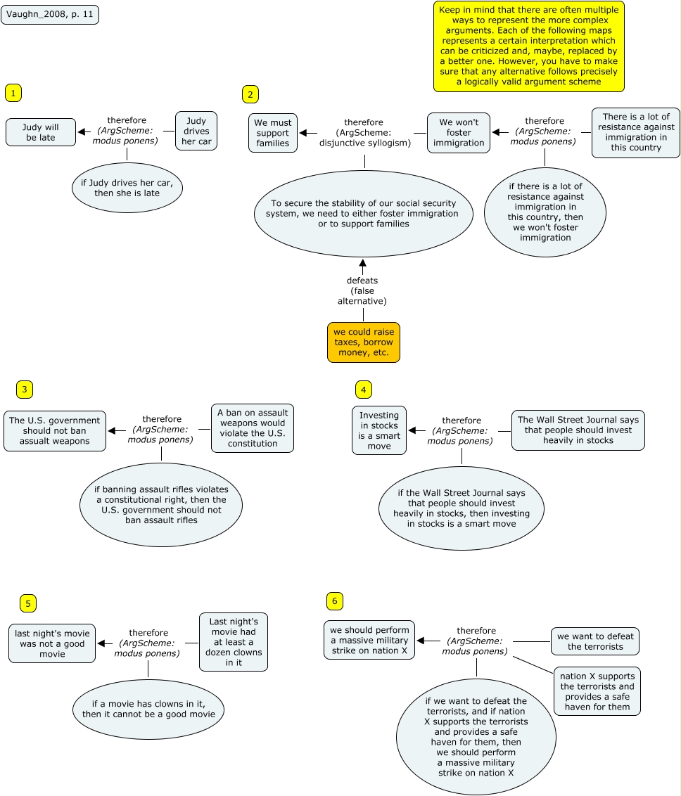 This Concept Map, created with IHMC CmapTools, has information related to: Ex.1-6_ p.11-simplest, A ban on assault weapons would violate the U.S. constitution therefore (ArgScheme: modus ponens) The U.S. government should not ban assualt weapons, The Wall Street Journal says that people should invest heavily in stocks therefore (ArgScheme: modus ponens) Investing in stocks is a smart move, if there is a lot of resistance against immigration in this country, then we won't foster immigration therefore (ArgScheme: modus ponens) We won't foster immigration, if Judy drives her car, then she is late therefore (ArgScheme: modus ponens) Judy will be late, To secure the stability of our social security system, we need to either foster immigration or to support families therefore (ArgScheme: disjunctive syllogism) We must support families, we could raise taxes, borrow money, etc. defeats (false alternative) To secure the stability of our social security system, we need to either foster immigration or to support families, we want to defeat the terrorists therefore (ArgScheme: modus ponens) we should perform a massive military strike on nation X, if the Wall Street Journal says that people should invest heavily in stocks, then investing in stocks is a smart move therefore (ArgScheme: modus ponens) Investing in stocks is a smart move, nation X supports the terrorists and provides a safe haven for them therefore (ArgScheme: modus ponens) we should perform a massive military strike on nation X, if banning assault rifles violates a constitutional right, then the U.S. government should not ban assault rifles therefore (ArgScheme: modus ponens) The U.S. government should not ban assualt weapons, There is a lot of resistance against immigration in this country therefore (ArgScheme: modus ponens) We won't foster immigration, Last night's movie had at least a dozen clowns in it therefore (ArgScheme: modus ponens) last night's movie was not a good movie, if we want to defeat the terrorists, and if nation X supports the terrorists and provides a safe haven for them, then we should perform a massive military strike on nation X therefore (ArgScheme: modus ponens) we should perform a massive military strike on nation X, Judy drives her car therefore (ArgScheme: modus ponens) Judy will be late, if a movie has clowns in it, then it cannot be a good movie therefore (ArgScheme: modus ponens) last night's movie was not a good movie, We won't foster immigration therefore (ArgScheme: disjunctive syllogism) We must support families