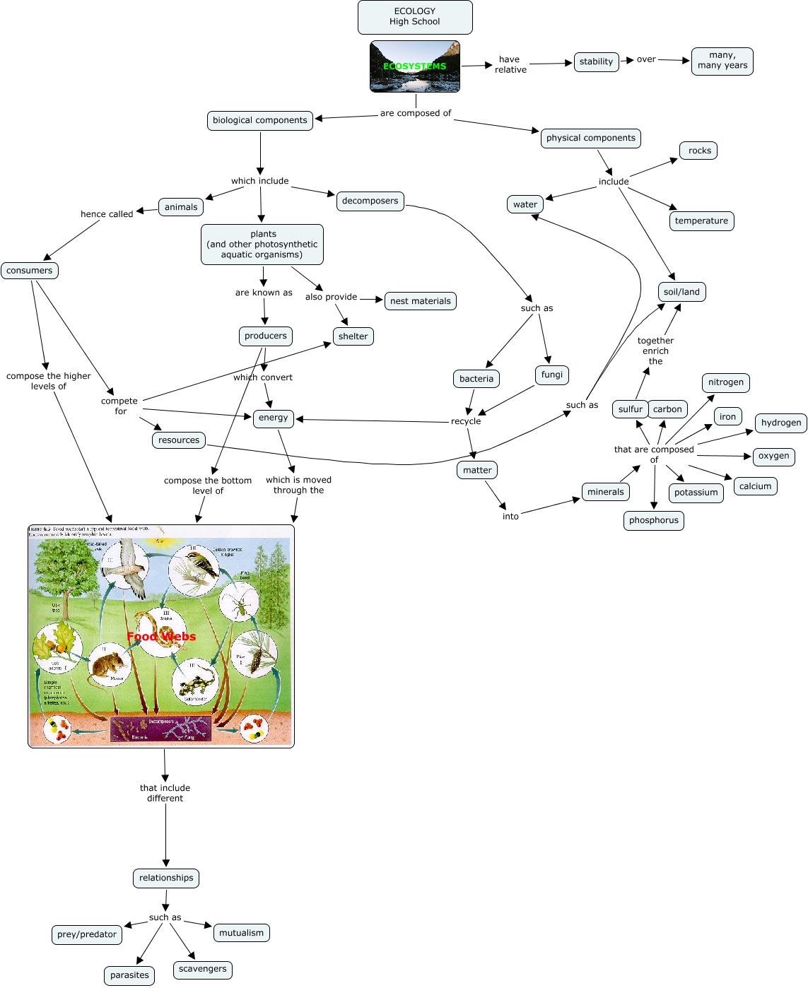 This Concept Map, created with IHMC CmapTools, has information related to: Rivera_Marelis_CMap1_Ecosystems, bacteria recycle energy, physical components include rocks, relationships such as prey/predator, relationships such as parasites, consumers compete for shelter, resources such as soil/land, ECOSYSTEMS have relative stability, minerals that are composed of sulfur, energy which is moved through the Food Webs, minerals that are composed of potassium, biological components which include plants (and other photosynthetic aquatic organisms), decomposers such as bacteria, producers compose the bottom level of Food Webs, minerals that are composed of hydrogen, consumers compete for resources, fungi recycle matter, matter into minerals, minerals that are composed of nitrogen, fungi recycle energy, minerals that are composed of iron