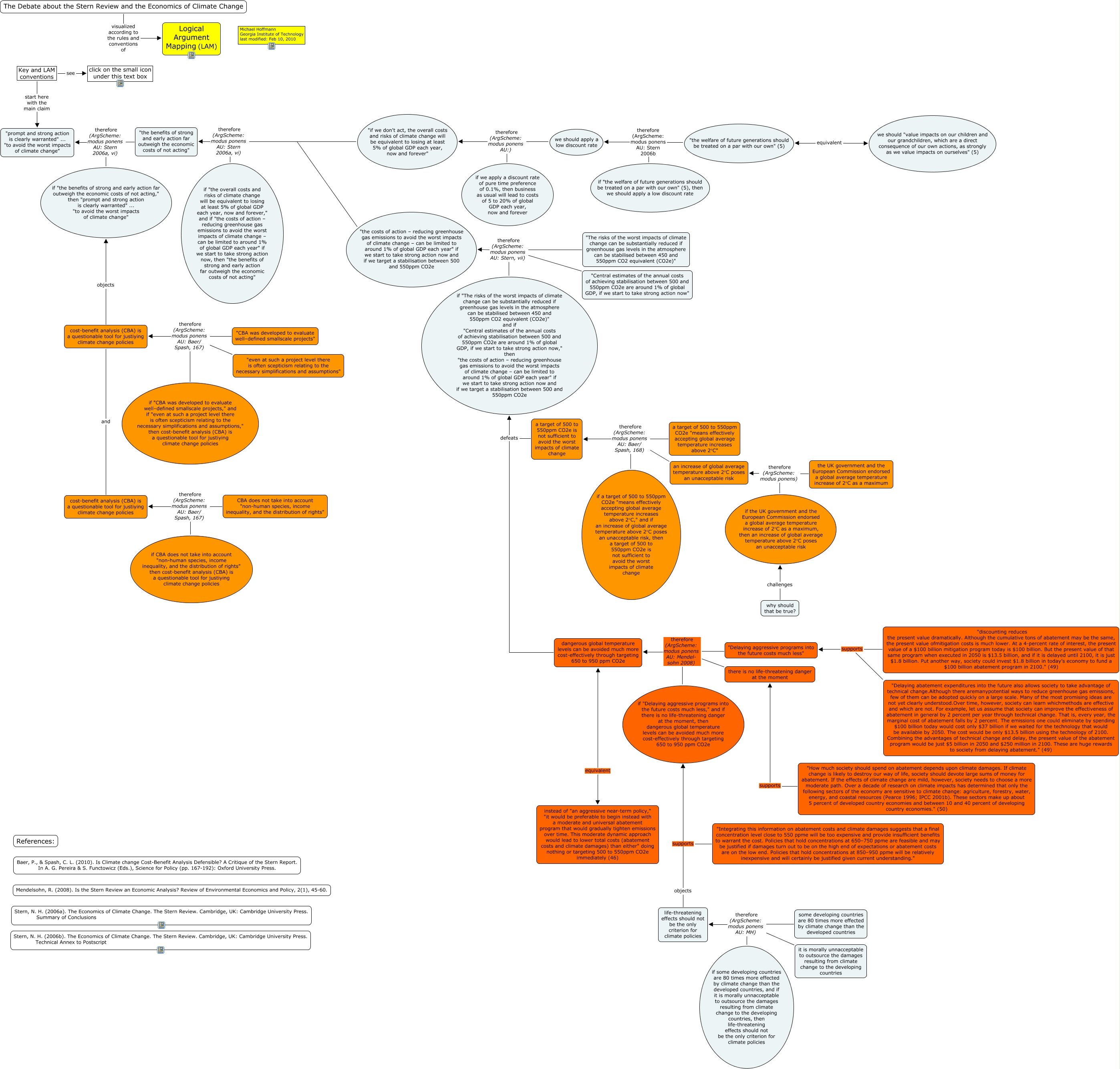 This Concept Map, created with IHMC CmapTools, has information related to: Stern review_2007, "the costs of action – reducing greenhouse gas emissions to avoid the worst impacts of climate change – can be limited to around 1% of global GDP each year" if we start to take strong action now and if we target a stabilisation between 500 and 550ppm CO2e therefore (ArgScheme: modus ponens AU: Stern 2006a, vi) "the benefits of strong and early action far outweigh the economic costs of not acting", Key and LAM conventions start here with the main claim "prompt and strong action is clearly warranted" ... "to avoid the worst impacts of climate change", if "CBA was developed to evaluate well–defined smallscale projects," and if "even at such a project level there is often scepticism relating to the necessary simplifications and assumptions," then cost-benefit analysis (CBA) is a questionable tool for justiying climate change policies therefore (ArgScheme: modus ponens AU: Baer/ Spash, 167) cost-benefit analysis (CBA) is a questionable tool for justiying climate change policies, cost-benefit analysis (CBA) is a questionable tool for justiying climate change policies and cost-benefit analysis (CBA) is a questionable tool for justiying climate change policies, "The risks of the worst impacts of climate change can be substantially reduced if greenhouse gas levels in the atmosphere can be stabilised between 450 and 550ppm CO2 equivalent (CO2e)" therefore (ArgScheme: modus ponens AU: Stern, vii) "the costs of action – reducing greenhouse gas emissions to avoid the worst impacts of climate change – can be limited to around 1% of global GDP each year" if we start to take strong action now and if we target a stabilisation between 500 and 550ppm CO2e, "the benefits of strong and early action far outweigh the economic costs of not acting" therefore (ArgScheme: modus ponens AU: Stern 2006a, vi) "prompt and strong action is clearly warranted" ... "to avoid the worst impacts of climate change", "How much society should spend on abatement depends upon climate damages. If climate change is likely to destroy our way of life, society should devote large sums of money for abatement. If the effects of climate change are mild, however, society needs to choose a more moderate path. Over a decade of research on climate impacts has determined that only the following sectors of the economy are sensitive to climate change: agriculture, forestry, water, energy, and coastal resources (Pearce 1996; IPCC 2001b). These sectors make up about 5 percent of developed country economies and between 10 and 40 percent of developing country economies." (50) supports there is no life-threatening danger at the moment, The Debate about the Stern Review and the Economics of Climate Change visualized according to the rules and conventions of Logical Argument Mapping (LAM), CBA does not take into account "non-human species, income inequality, and the distribution of rights" therefore (ArgScheme: modus ponens AU: Baer/ Spash, 167) cost-benefit analysis (CBA) is a questionable tool for justiying climate change policies, "Delaying abatement expenditures into the future also allows society to take advantage of technical change.Although there aremanypotential ways to reduce greenhouse gas emissions, few of them can be adopted quickly on a large scale. Many of the most promising ideas are not yet clearly understood.Over time, however, society can learn whichmethods are effective and which are not. For example, let us assume that society can improve the effectiveness of abatement in general by 2 percent per year through technical change. That is, every year, the marginal cost of abatement falls by 2 percent. The emissions one could eliminate by spending $100 billion today would cost only $37 billion if we waited for the technology that would be available by 2050. The cost would be only $13.5 billion using the technology of 2100. Combining the advantages of technical change and delay, the present value of the abatement program would be just $5 billion in 2050 and $250 million in 2100. These are huge rewards to society from delaying abatement." (49) supports "Delaying aggressive programs into the future costs much less", if some developing countries are 80 times more effected by climate change than the developed countries, and if it is morally unnacceptable to outsource the damages resulting from climate change to the developing countries, then life-threatening effects should not be the only criterion for climate policies therefore (ArgScheme: modus ponens AU: MH) life-threatening effects should not be the only criterion for climate policies, if "the benefits of strong and early action far outweigh the economic costs of not acting," then "prompt and strong action is clearly warranted" ... "to avoid the worst impacts of climate change" therefore (ArgScheme: modus ponens AU: Stern 2006a, vi) "prompt and strong action is clearly warranted" ... "to avoid the worst impacts of climate change", if the UK government and the European Commission endorsed a global average temperature increase of 2°C as a maximum, then an increase of global average temperature above 2°C poses an unacceptable risk therefore (ArgScheme: modus ponens) an increase of global average temperature above 2°C poses an unacceptable risk, "even at such a project level there is often scepticism relating to the necessary simplifications and assumptions" therefore (ArgScheme: modus ponens AU: Baer/ Spash, 167) cost-benefit analysis (CBA) is a questionable tool for justiying climate change policies, it is morally unnacceptable to outsource the damages resulting from climate change to the developing countries therefore (ArgScheme: modus ponens AU: MH) life-threatening effects should not be the only criterion for climate policies, life-threatening effects should not be the only criterion for climate policies objects if "Delaying aggressive programs into the future costs much less," and 