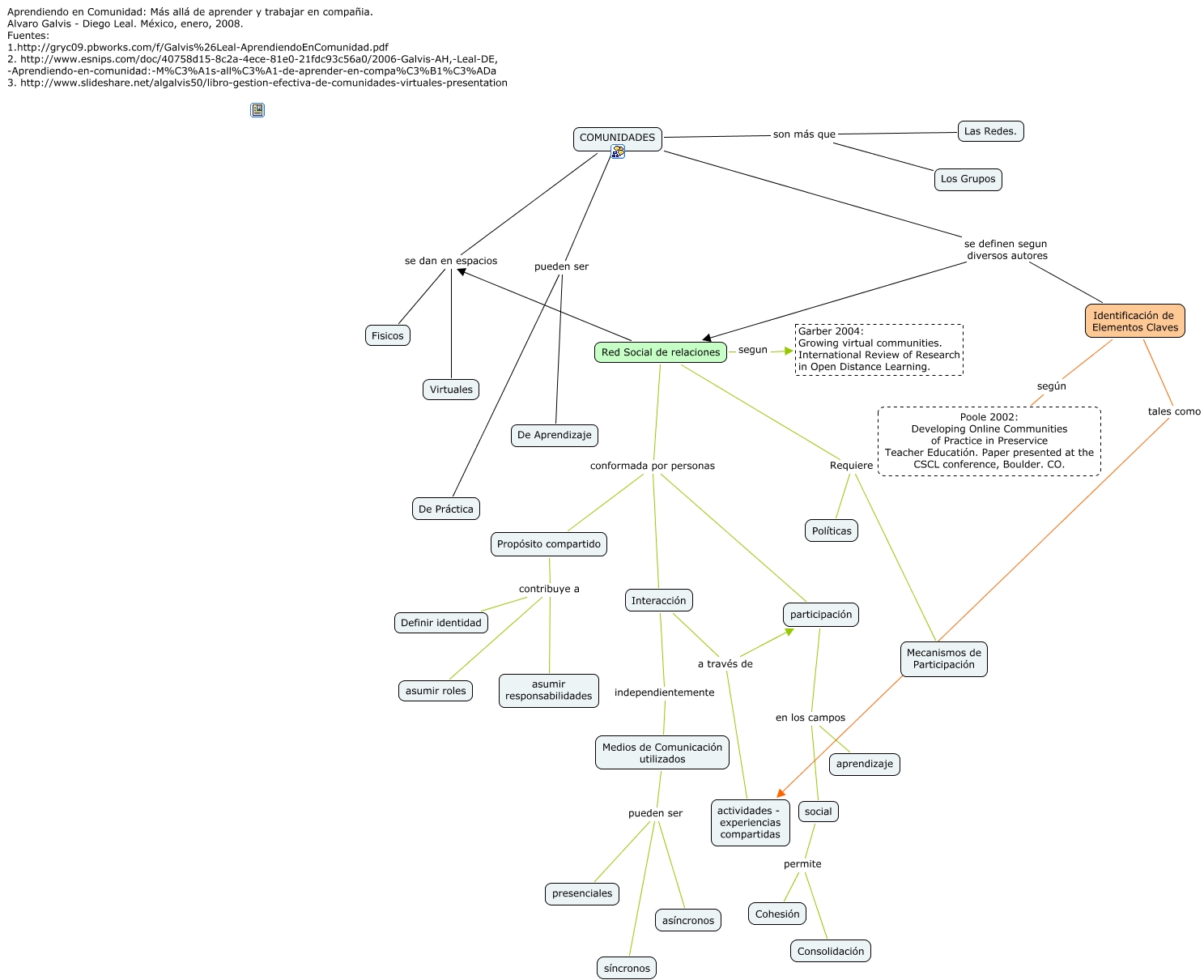 Este Cmap, tiene información relacionada con: Aplicaciones Educativas de la Web 2.0, Medios de Comunicación utilizados pueden ser síncronos, Red Social de relaciones Requiere Mecanismos de Participación, Red Social de relaciones Requiere Políticas, Medios de Comunicación utilizados pueden ser asíncronos, COMUNIDADES se definen segun diversos autores Identificación de Elementos Claves, Interacción independientemente Medios de Comunicación utilizados, Red Social de relaciones conformada por personas participación, Red Social de relaciones se dan en espacios Virtuales, social permite Cohesión, participación en los campos aprendizaje, COMUNIDADES se dan en espacios Virtuales, participación en los campos social, Interacción a través de actividades - experiencias compartidas, Medios de Comunicación utilizados pueden ser presenciales, COMUNIDADES son más que Los Grupos, Red Social de relaciones segun Garber 2004: Growing virtual communities. International Review of Research in Open Distance Learning., Identificación de Elementos Claves tales como actividades - experiencias compartidas, Interacción a través de participación, social permite Consolidación, Propósito compartido contribuye a Definir identidad