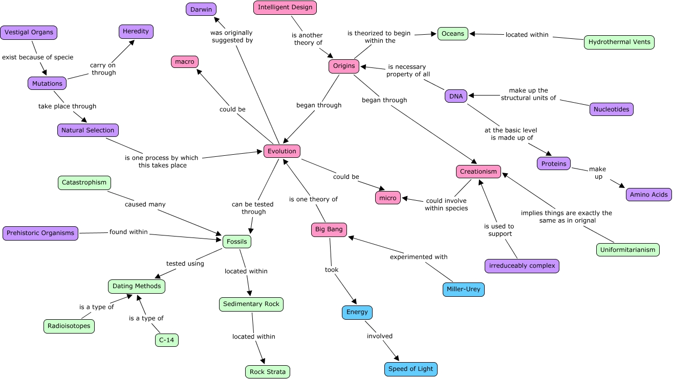 This Concept Map, created with IHMC CmapTools, has information related to: Origins Sam, Mutations carry on through Heredity, Big Bang took Energy, Catastrophism caused many Fossils, Energy involved Speed of Light, DNA at the basic level is made up of Proteins, Hydrothermal Vents located within Oceans, Evolution can be tested through Fossils, Proteins make up Amino Acids, Evolution could be micro, Big Bang is one theory of Evolution, Miller-Urey experimented with Big Bang, Natural Selection is one process by which this takes place Evolution, Vestigal Organs exist because of specie Mutations, Intelligent Design is another theory of Origins, Prehistoric Organisms found within Fossils, Fossils tested using Dating Methods, Sedimentary Rock located within Rock Strata, Origins is theorized to begin within the Oceans, Uniformitarianism implies things are exactly the same as in orignal Creationism, Nucleotides make up the structural units of DNA