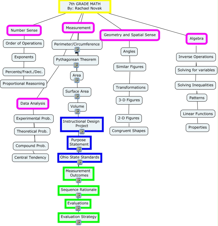 This Concept Map, created with IHMC CmapTools, has information related to: rnovak.cmap on curriculum design, Measurement Area, Perimeter/Circumference ???? Measurement, 7th GRADE MATH By: Rachael Novak Number Sense, 7th GRADE MATH By: Rachael Novak Algebra, 7th GRADE MATH By: Rachael Novak ???? Data Analysis, 7th GRADE MATH By: Rachael Novak Includes Measurement, Angles ???? Similar Figures, Solving Inequalities ???? Patterns, Evaluation Strategy ???? Evaluations, Data Analysis ???? Experimental Prob., Pythagorean Theorem Measurement Outcomes, Compound Prob. ???? Central Tendency, Linear Functions ???? Properties, Algebra ???? Inverse Operations, Inverse Operations ???? Solving Inequalities, Solving Inequalities ???? Linear Functions, Measurement Perimeter/Circumference, Similar Figures ???? 2-D Figures, Number Sense ???? Proportional Reasoning, Evaluations ???? Measurement Outcomes