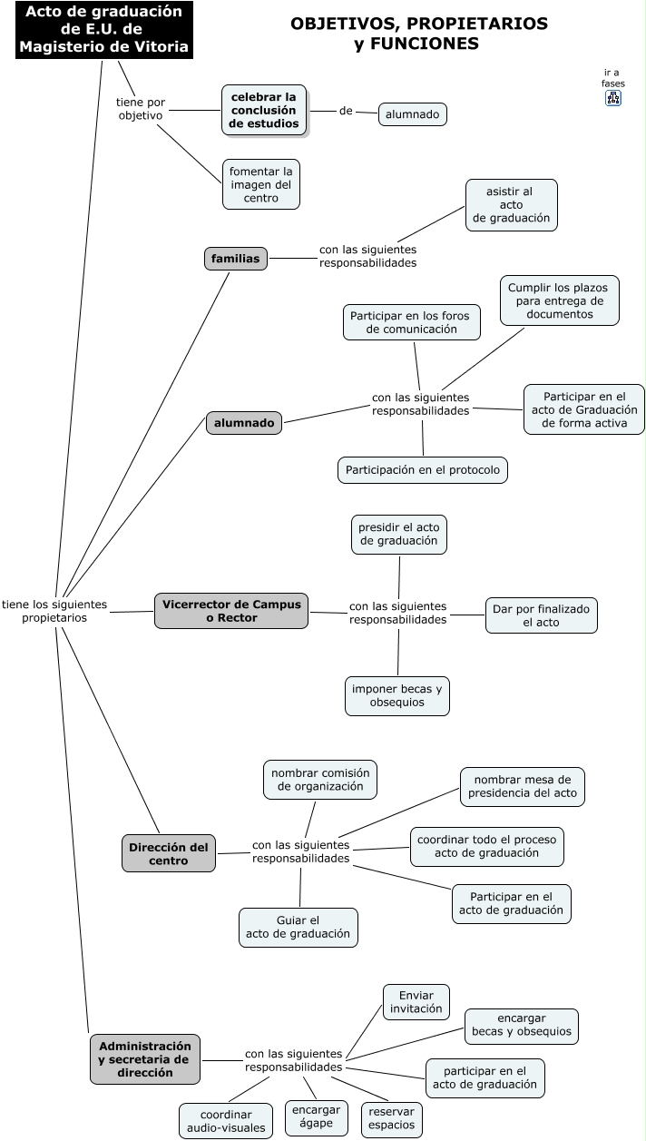 Este Cmap, tiene información relacionada con: Graduación_a, Vicerrector de Campus o Rector con las siguientes responsabilidades presidir el acto de graduación, Administración y secretaria de dirección con las siguientes responsabilidades reservar espacios, Acto de graduación de E.U. de Magisterio de Vitoria tiene los siguientes propietarios Dirección del centro, Dirección del centro con las siguientes responsabilidades coordinar todo el proceso acto de graduación, Dirección del centro con las siguientes responsabilidades nombrar comisión de organización, Administración y secretaria de dirección con las siguientes responsabilidades encargar becas y obsequios, Acto de graduación de E.U. de Magisterio de Vitoria tiene por objetivo celebrar la conclusión de estudios, Dirección del centro con las siguientes responsabilidades Guiar el acto de graduación, Dirección del centro con las siguientes responsabilidades Participar en el acto de graduación, Administración y secretaria de dirección con las siguientes responsabilidades coordinar audio-visuales, celebrar la conclusión de estudios de alumnado, alumnado con las siguientes responsabilidades Participar en el acto de Graduación de forma activa, Vicerrector de Campus o Rector con las siguientes responsabilidades Dar por finalizado el acto, Administración y secretaria de dirección con las siguientes responsabilidades Enviar invitación, Administración y secretaria de dirección con las siguientes responsabilidades participar en el acto de graduación, Administración y secretaria de dirección con las siguientes responsabilidades encargar ágape, Vicerrector de Campus o Rector con las siguientes responsabilidades imponer becas y obsequios, Acto de graduación de E.U. de Magisterio de Vitoria tiene los siguientes propietarios Vicerrector de Campus o Rector, Acto de graduación de E.U. de Magisterio de Vitoria tiene los siguientes propietarios Administración y secretaria de dirección, Acto de graduación de E.U. de Magisterio de Vitoria tiene los siguientes propietarios familias