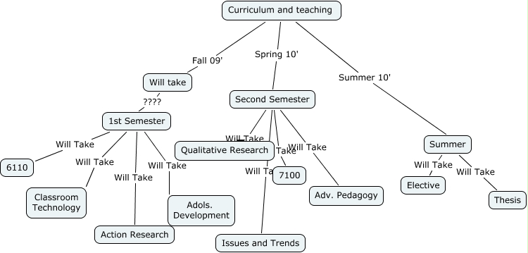 This Concept Map, created with IHMC CmapTools, has information related to: doubrava_Practice, Second Semester Will Take 7100, 1st Semester Will Take Adols. Development, Curriculum and teaching Summer 10' Summer, 1st Semester Will Take Action Research, Second Semester Will Take Adv. Pedagogy, Summer Will Take Elective, Curriculum and teaching Spring 10' Second Semester, Second Semester Will Take Qualitative Research, 1st Semester Will Take 6110, 1st Semester Will Take Classroom Technology, Will take ???? 1st Semester, Second Semester Will Take Issues and Trends, Summer Will Take Thesis, Curriculum and teaching Fall 09' Will take