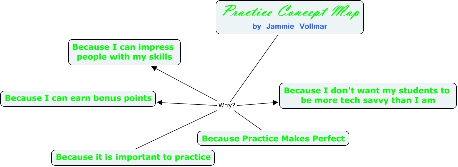 This Concept Map, created with IHMC CmapTools, has information related to: vollmar_practice cmap, Practice Concept Map by Jammie Vollmar Why? Because Practice Makes Perfect, Practice Concept Map by Jammie Vollmar Why? Because I can earn bonus points, Practice Concept Map by Jammie Vollmar Why? Because I can impress people with my skills, Practice Concept Map by Jammie Vollmar Why? Because I don't want my students to be more tech savvy than I am, Practice Concept Map by Jammie Vollmar Why? Because it is important to practice