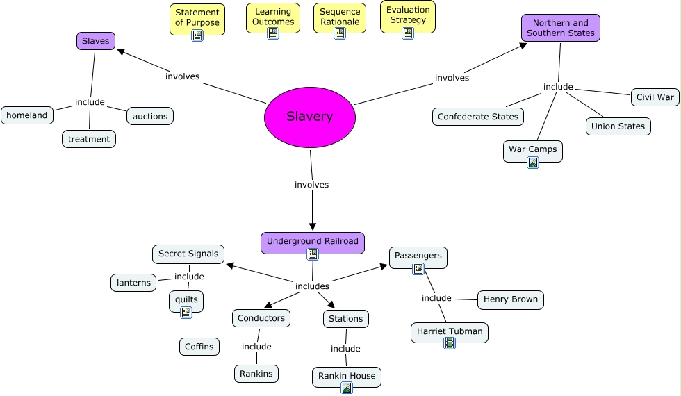 This Concept Map, created with IHMC CmapTools, has information related to: Rhonda Martin - Slavery, Underground Railroad includes Stations, Slavery involves Slaves, Secret Signals include lanterns, Underground Railroad includes Secret Signals, Slavery involves Northern and Southern States, Slaves include treatment, Conductors include Rankins, Passengers include Henry Brown, Conductors include Coffins, Slaves include homeland, Underground Railroad includes Passengers, Northern and Southern States include Civil War, Underground Railroad includes Conductors, Slaves include auctions, Passengers include Harriet Tubman, Northern and Southern States include War Camps, Slavery involves Underground Railroad, Northern and Southern States include Union States, Stations include Rankin House, Secret Signals include quilts