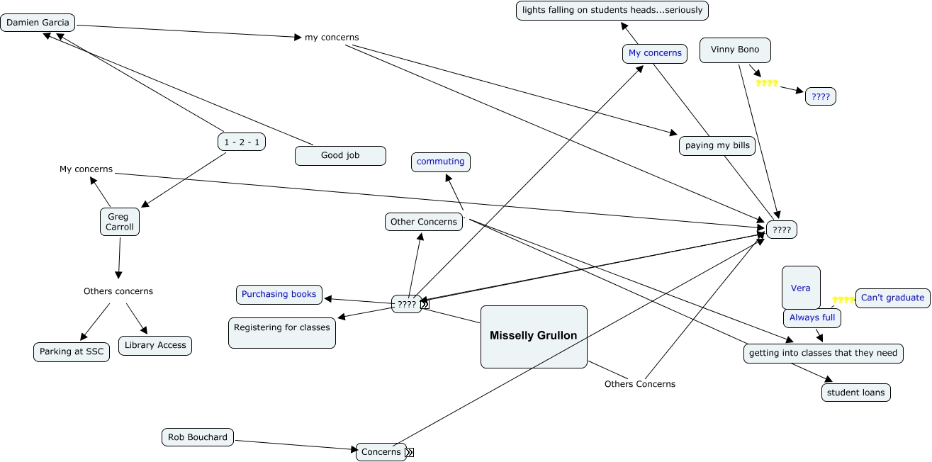 This Concept Map, created with IHMC CmapTools, has information related to: 1to1, ???? Jason Rexinis My concerns, Rob Bouchard concerns Where to work, Damien Garcia my concerns paying my bills, Damien Garcia my concerns ????, Other Concerns getting into classes that they need, Misselly Grullon My Concerns Purchasing books, ???? Jason Rexinis Other Concerns, ???? Jason Rexinis Registering for classes, Misselly Grullon My Concerns Insuring my car, Always full ???? Can't graduate, Vinny Bono ????, Rob Bouchard concerns ????, Rob Bouchard concerns How to pay my bills, Greg Carroll Others concerns Library Access, Misselly Grullon My Concerns Financing summer study abroad, Greg Carroll Others concerns Parking at SSC, Misselly Grullon Others Concerns ????, Vinny Bono ???? ????, ???? lights falling on students heads...seriously, 1 - 2 - 1 Greg Carroll