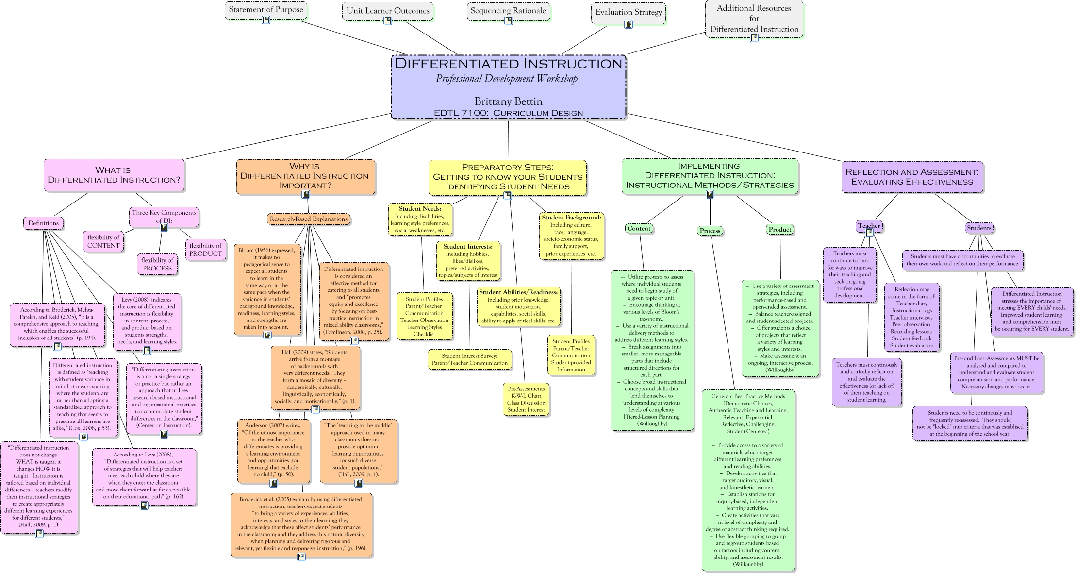 This Concept Map, created with IHMC CmapTools, has information related to: Bettin_Curriculum Design on DI, Statement of Purpose Differentiated Instruction Professional Development Workshop Brittany Bettin EDTL 7100: Curriculum Design Reflection and Assessment: Evaluating Effectiveness, What is Differentiated Instruction? Three Key Components of DI: flexibility of PRODUCT, Preparatory Steps: Getting to know your Students Identifying Student Needs Student Needs: Including disabilities, learning style preferences, social weaknesses, etc. Student Profiles Parent/Teacher Communication Teacher Observation Learning Styles Checklist, Statement of Purpose Differentiated Instruction Professional Development Workshop Brittany Bettin EDTL 7100: Curriculum Design Why is Differentiated Instruction Important?, Reflection and Assessment: Evaluating Effectiveness Students Differentiated Instruction stresses the importance of meeting EVERY childs' needs. Improved student learning and comprehension must be occuring for EVERY student., What is Differentiated Instruction? Definitions “Differentiated instruction does not change WHAT is taught; it changes HOW it is taught. Instruction is tailored based on individual differences… teachers modify their instructional strategies to create appropriately different learning experiences for different students,” (Hall, 2009, p. 1)., Preparatory Steps: Getting to know your Students Identifying Student Needs Student Interests: Including hobbies, likes/dislikes, preferred activities, topics/subjects of interest Student Interest Surveys Parent/Teacher Communication, Reflection and Assessment: Evaluating Effectiveness Students Pre- and Post- Assessments MUST be analyzed and compared to understand and evaluate student comprehension and performance. Necessary changes must occur., Reflection and Assessment: Evaluating Effectiveness Teacher Reflection may come in the form of: Teacher diary Instructional logs Teacher interviews Peer observation Recording lessons Student feedback Student evaluation, Implementing Differentiated Instruction: Instructional Methods/Strategies Content --- Utilize pre-tests to assess where individual students need to begin study of a given topic or unit. --- Encourage thinking at various levels of Bloom's taxonomy. --- Use a variety of instructional delivery methods to address different learning styles. --- Break assignments into smaller, more manageable parts that include structured directions for each part. --- Choose broad instructional concepts and skills that lend themselves to understanding at various levels of complexity. [Tiered-Lesson Planning] (Willoughby), Statement of Purpose Differentiated Instruction Professional Development Workshop Brittany Bettin EDTL 7100: Curriculum Design What is Differentiated Instruction?, Reflection and Assessment: Evaluating Effectiveness Teacher Teachers must continously and critically reflect on and evaluate the effectiveness (or lack of) of their teaching on student learning., Why is Differentiated Instruction Important? Research-Based Explanations Differentiated instruction is considered an effective method for catering to all students and “promotes equity and excellence by focusing on best- practice instruction in mixed ability classrooms,” (Tomlinson, 2000, p. 25)., Statement of Purpose Differentiated Instruction Professional Development Workshop Brittany Bettin EDTL 7100: Curriculum Design Sequencing Rationale, What is Differentiated Instruction? Definitions "Differentiating instruction is a not a single strategy or practice but rather an approach that utilizes research-based instructional and organizational practices to accommodate student differences in the classroom," (Center on Instruction)., Statement of Purpose Differentiated Instruction Professional Development Workshop Brittany Bettin EDTL 7100: Curriculum Design Additional Resources for Differentiated Instruction, Why is Differentiated Instruction Important? Research-Based Explanations Hall (2009) states, “Students arrive from a montage of backgrounds with very different needs. They form a mosaic of diversity – academically, culturally, linguistically, economically, socially, and motivationally,” (p. 1)., What is Differentiated Instruction? Definitions Levy (2008), indicates the core of differentiated instruction is flexibility in content, process, and product based on students strengths, needs, and learning styles., Implementing Differentiated Instruction: Instructional Methods/Strategies Process General: Best Practice Methods (Democratic Choices, Authentic Teaching and Learning, Relevant, Experential, Reflective, Challenging, Student-Centered) --- Provide access to a variety of materials which target different learning preferences and reading abilities. --- Develop activities that target auditory, visual, and kinesthetic learners. --- Establish stations for inquiry-based, independent learning activities. --- Create activities that vary in level of complexity and degree of abstract thinking required. --- Use flexible grouping to group and regroup students based on factors including content, ability, and assessment results. (Willoughby), Statement of Purpose Differentiated Instruction Professional Development Workshop Brittany Bettin EDTL 7100: Curriculum Design Unit Learner Outcomes
