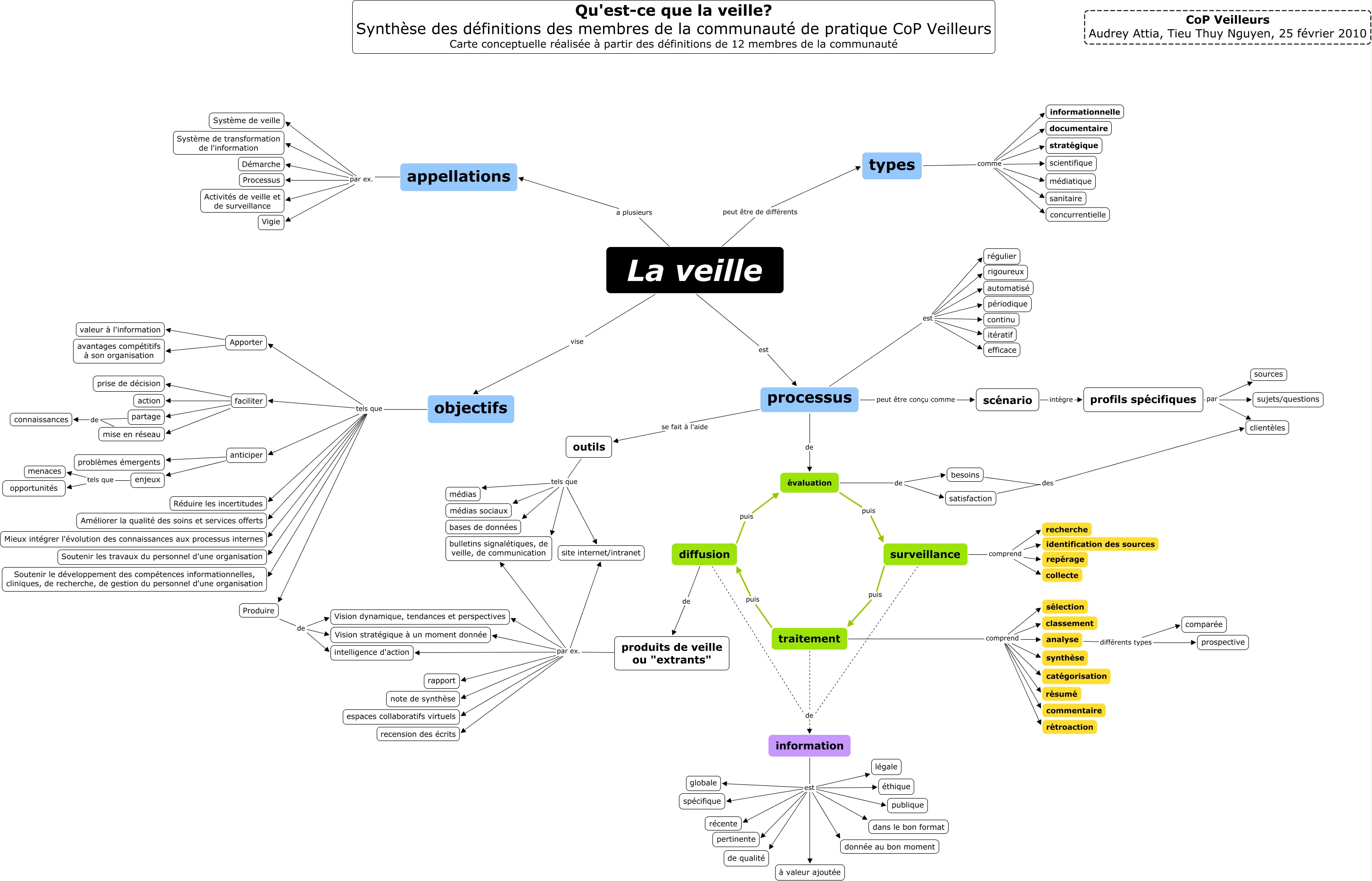 Cette carte de concepts créée avec IHMC CmapTools traite de: Veille_definition_aa-ttn_20100225VF, satisfaction des clientèles, traitement comprend sélection, types comme scientifique, faciliter action, profils spécifiques par sources, information est légale, processus est automatisé, Apporter valeur à l'information, faciliter partage, faciliter mise en réseau, processus est continu, types comme médiatique, Apporter avantages compétitifs à son organisation, La veille vise objectifs, information est éthique, types comme sanitaire, information est pertinente, profils spécifiques par clientèles, objectifs tels que Réduire les incertitudes, La veille a plusieurs appellations