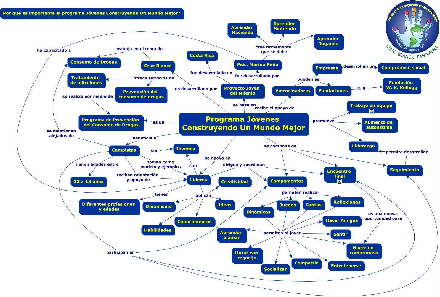 Este Cmap, tiene información relacionada con: Jóvenes Construyendo Un Mundo Mejor, Cantos permiten al joven Aprender a amar, Cantos permiten al joven Llorar con regocijo, Juegos permiten al joven Socializar, Campistas participan en Encuentro final, Juegos permiten al joven Hacer un compromiso, Líderes aplican Creatividad, Programa Jóvenes Construyendo Un Mundo Mejor recibe el apoyo de Patrocinadores, Dinámicas permiten al joven Socializar, Programa Jóvenes Construyendo Un Mundo Mejor se compone de Seguimiento, Cantos permiten al joven Socializar, Cantos permiten al joven Sentir, Cruz Blanca trabaja en el tema de Consumo de Drogas, Líderes dirigen y coordinan Campamentos, Dinámicas permiten al joven Entretenerse, Líderes son Jóvenes, Patrocinadores pueden ser Fundaciones, Campistas participan en Campamentos, Programa Jóvenes Construyendo Un Mundo Mejor se compone de Encuentro final, Líderes dirigen y coordinan Encuentro final, Cruz Blanca ofrece servicios de Prevención del consumo de drogas