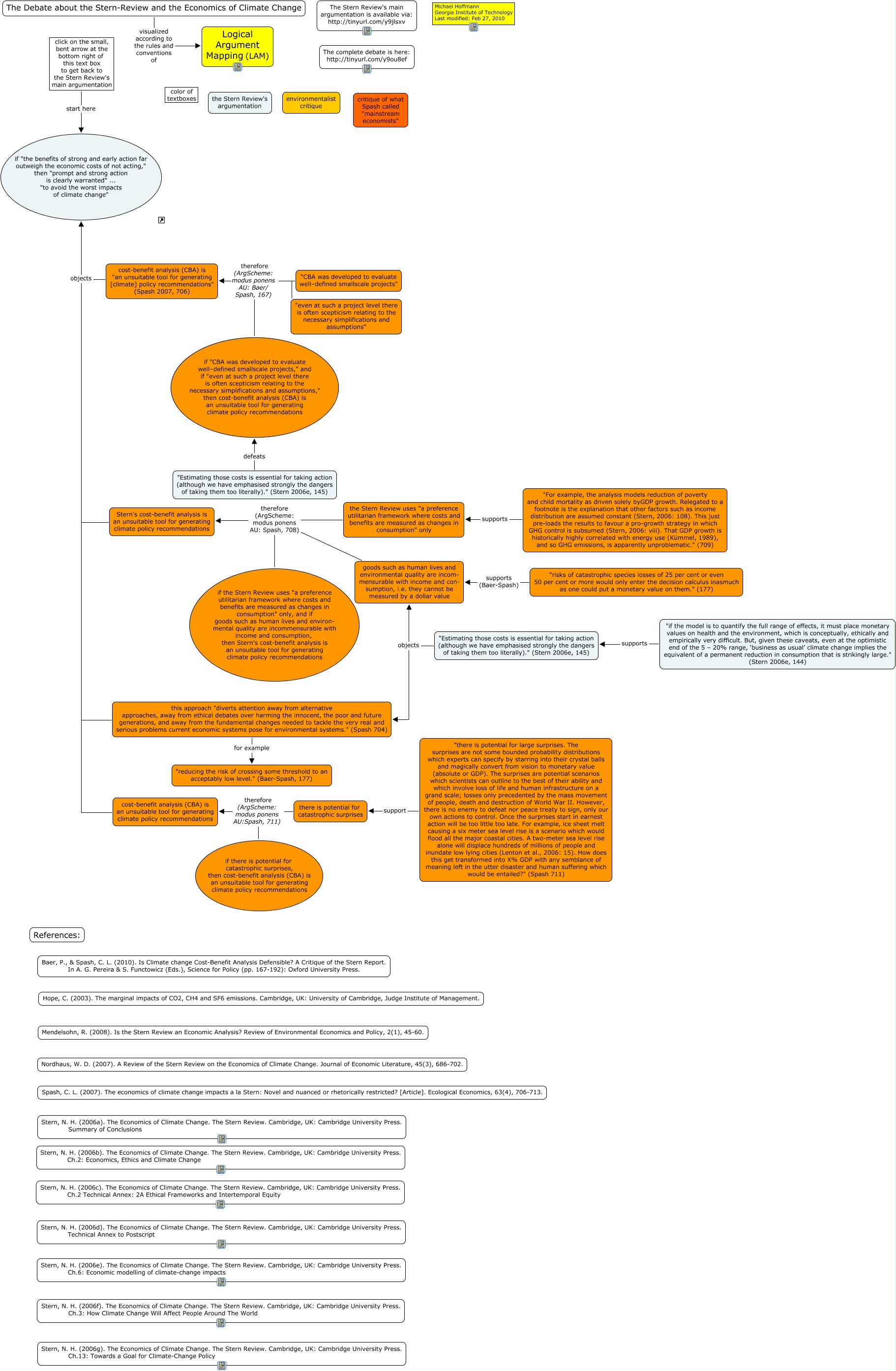 This Concept Map, created with IHMC CmapTools, has information related to: Problems-of-Cost-Benefit-Analysis, if "CBA was developed to evaluate well–defined smallscale projects," and if "even at such a project level there is often scepticism relating to the necessary simplifications and assumptions," then cost-benefit analysis (CBA) is an unsuitable tool for generating climate policy recommendations therefore (ArgScheme: modus ponens AU: Baer/ Spash, 167) cost-benefit analysis (CBA) is "an unsuitable tool for generating [climate] policy recommendations" (Spash 2007, 706), if there is potential for catastrophic surprises, then cost-benefit analysis (CBA) is an unsuitable tool for generating climate policy recommendations therefore (ArgScheme: modus ponens AU:Spash, 711) cost-benefit analysis (CBA) is an unsuitable tool for generating climate policy recommendations, click on the small, bent arrow at the bottom right of this text box to get back to the Stern Review's main argumentation start here if "the benefits of strong and early action far outweigh the economic costs of not acting," then "prompt and strong action is clearly warranted" ... "to avoid the worst impacts of climate change", "if the model is to quantify the full range of effects, it must place monetary values on health and the environment, which is conceptually, ethically and empirically very difficult. But, given these caveats, even at the optimistic end of the 5 – 20% range, ‘business as usual’ climate change implies the equivalent of a permanent reduction in consumption that is strikingly large." (Stern 2006e, 144) supports "Estimating those costs is essential for taking action (although we have emphasised strongly the dangers of taking them too literally)." (Stern 2006e, 145), if the Stern Review uses "a preference utilitarian framework where costs and benefits are measured as changes in consumption" only, and if goods such as human lives and environ- mental quality are incommensurable with income and consumption, then Stern's cost-benefit analysis is an unsuitable tool for generating climate policy recommendations therefore (ArgScheme: modus ponens AU: Spash, 708) Stern's cost-benefit analysis is an unsuitable tool for generating climate policy recommendations, the Stern Review uses "a preference utilitarian framework where costs and benefits are measured as changes in consumption" only therefore (ArgScheme: modus ponens AU: Spash, 708) Stern's cost-benefit analysis is an unsuitable tool for generating climate policy recommendations, "Estimating those costs is essential for taking action (although we have emphasised strongly the dangers of taking them too literally)." (Stern 2006e, 145) defeats if "CBA was developed to evaluate well–defined smallscale projects," and if "even at such a project level there is often scepticism relating to the necessary simplifications and assumptions," then cost-benefit analysis (CBA) is an unsuitable tool for generating climate policy recommendations, "Estimating those costs is essential for taking action (although we have emphasised strongly the dangers of taking them too literally)." (Stern 2006e, 145) objects this approach "diverts attention away from alternative approaches, away from ethical debates over harming the innocent, the poor and future generations, and away from the fundamental changes needed to tackle the very real and serious problems current economic systems pose for environmental systems." (Spash 704), "even at such a project level there is often scepticism relating to the necessary simplifications and assumptions" therefore (ArgScheme: modus ponens AU: Baer/ Spash, 167) cost-benefit analysis (CBA) is "an unsuitable tool for generating [climate] policy recommendations" (Spash 2007, 706), this approach "diverts attention away from alternative approaches, away from ethical debates over harming the innocent, the poor and future generations, and away from the fundamental changes needed to tackle the very real and serious problems current economic systems pose for environmental systems." (Spash 704) for example "reducing the risk of crossing some threshold to an acceptably low level." (Baer-Spash, 177), "Estimating those costs is essential for taking action (although we have emphasised strongly the dangers of taking them too literally)." (Stern 2006e, 145) objects goods such as human lives and environmental quality are incom- mensurable with income and con- sumption, i.e. they cannot be measured by a dollar value, "risks of catastrophic species losses of 25 per cent or even 50 per cent or more would only enter the decision calculus inasmuch as one could put a monetary value on them." (177) supports (Baer-Spash) goods such as human lives and environmental quality are incom- mensurable with income and con- sumption, i.e. they cannot be measured by a dollar value, cost-benefit analysis (CBA) is "an unsuitable tool for generating [climate] policy recommendations" (Spash 2007, 706) objects if "the benefits of strong and early action far outweigh the economic costs of not acting," then "prompt and strong action is clearly warranted" ... "to avoid the worst impacts of climate change", "there is potential for large surprises. The surprises are not some bounded probability distributions which experts can specify by starring into their crystal balls and magically convert from vision to monetary value (absolute or GDP). The surprises are potential scenarios which scientists can outline to the best of their ability and which involve loss of life and human infrastructure on a grand scale; losses only precedented by the mass movement of people, death and destruction of World War II. However, there is no enemy to defeat nor peace treaty to sign, only our own actions to control. Once the surprises start in earnest action will be too little too late. For example, ice sheet melt causing a six meter sea level rise is a scenario which would flood all the major coastal cities. A two-mete