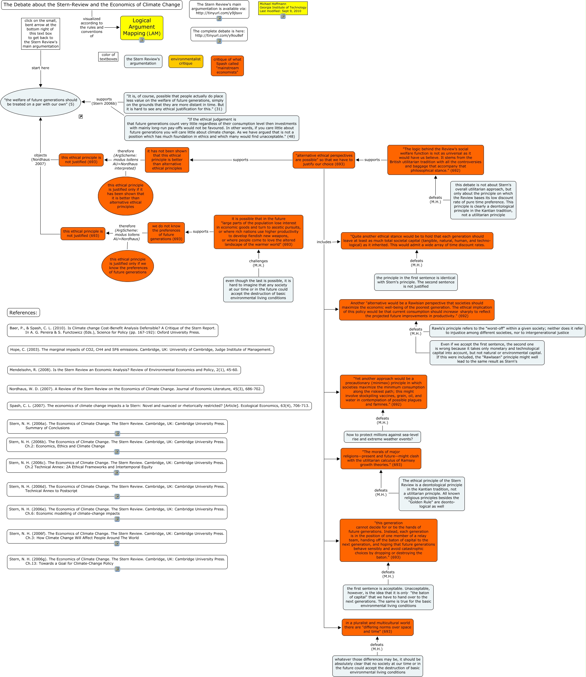 This Concept Map, created with IHMC CmapTools, has information related to: future-generations-on-a-par, even though the last is possible, it is hard to imagine that any society at our time or in the future could accept the destruction of basic environmental living conditions challenges (M.H.) it is possible that in the future "large parts of the population lose interest in economic goods and turn to ascetic pursuits, or where rich nations use higher productivity to develop fiendish new weapons, or where people come to love the altered landscape of the warmer world" (693), "alternative ethical perspectives are possible" so that we have to justify our choice (693) includes "The morals of major religions—present and future—might clash with the utilitarian calculus of Ramsey growth theories." (693), the principle in the first sentence is identical with Stern's principle. The second sentence is not justified defeats (M.H.) "Quite another ethical stance would be to hold that each generation should leave at least as much total societal capital (tangible, natural, human, and techno- logical) as it inherited. This would admit a wide array of time discount rates., "It is, of course, possible that people actually do place less value on the welfare of future generations, simply on the grounds that they are more distant in time. But it is hard to see any ethical justification for this." (31) supports (Stern 2006b) "the welfare of future generations should be treated on a par with our own" (5), Even if we accept the first sentence, the second one is wrong because it takes only monetary and technological capital into account, but not natural or environmental capital. If this were included, the "Rawlsean" principle might well lead to the same result as Stern's defeats (M.H.) Another "alternative would be a Rawlsian perspective that societies should maximize the economic well-being of the poorest generation. The ethical implication of this policy would be that current consumption should increase sharply to reflect the projected future improvements in productivity." (692), this ethical principle is not justified (693) objects (Nordhaus 2007) "the welfare of future generations should be treated on a par with our own" (5), "alternative ethical perspectives are possible" so that we have to justify our choice (693) includes "Quite another ethical stance would be to hold that each generation should leave at least as much total societal capital (tangible, natural, human, and techno- logical) as it inherited. This would admit a wide array of time discount rates., "alternative ethical perspectives are possible" so that we have to justify our choice (693) includes Another "alternative would be a Rawlsian perspective that societies should maximize the economic well-being of the poorest generation. The ethical implication of this policy would be that current consumption should increase sharply to reflect the projected future improvements in productivity." (692), we do not know the preferences of future generations (693) therefore (ArgScheme: modus tollens AU=Nordhaus) this ethical principle is not justified (693), the first sentence is acceptable. Unacceptable, however, is the idea that it is only "the baton of capital" that we have to hand over to the next generations. The same is true for the basic environmental living conditions defeats (M.H.) "this generation cannot decide for or tie the hands of future generations. Instead, each generation is in the position of one member of a relay team, handing off the baton of capital to the next generation, and hoping that future generations behave sensibly and avoid catastrophic choices by dropping or destroying the baton." (693), it is possible that in the future "large parts of the population lose interest in economic goods and turn to ascetic pursuits, or where rich nations use higher productivity to develop fiendish new weapons, or where people come to love the altered landscape of the warmer world" (693) supports we do not know the preferences of future generations (693), "alternative ethical perspectives are possible" so that we have to justify our choice (693) includes "this generation cannot decide for or tie the hands of future generations. Instead, each generation is in the position of one member of a relay team, handing off the baton of capital to the next generation, and hoping that future generations behave sensibly and avoid catastrophic choices by dropping or destroying the baton." (693), whatever those differences may be, it should be absolutely clear that no society at our time or in the future could accept the destruction of basic environmental living conditions defeats (M.H.) in a pluralist and multicultural world there are "differing norms over space and time" (693), Rawls's principle refers to the "worst-off" within a given society; neither does it refer to injustice among different societies, nor to intergenerational justice defeats (M.H.) Another "alternative would be a Rawlsian perspective that societies should maximize the economic well-being of the poorest generation. The ethical implication of this policy would be that current consumption should increase sharply to reflect the projected future improvements in productivity." (692), "alternative ethical perspectives are possible" so that we have to justify our choice (693) supports it has not been shown that this ethical principle is better than alternative ethical principles, click on the small, bent arrow at the bottom right of this text box to get back to the Stern Review's main argumentation start here "the welfare of future generations should be treated on a par with our own" (5), this ethical principle is justified only if we know the preferences of future generations therefore (ArgScheme: modus tollens AU=Nordhaus) this ethical principle is not justified (693), "alternative ethical perspectives are possible" so that we have to justify our choice (693) includes in a pluralist and multicul
