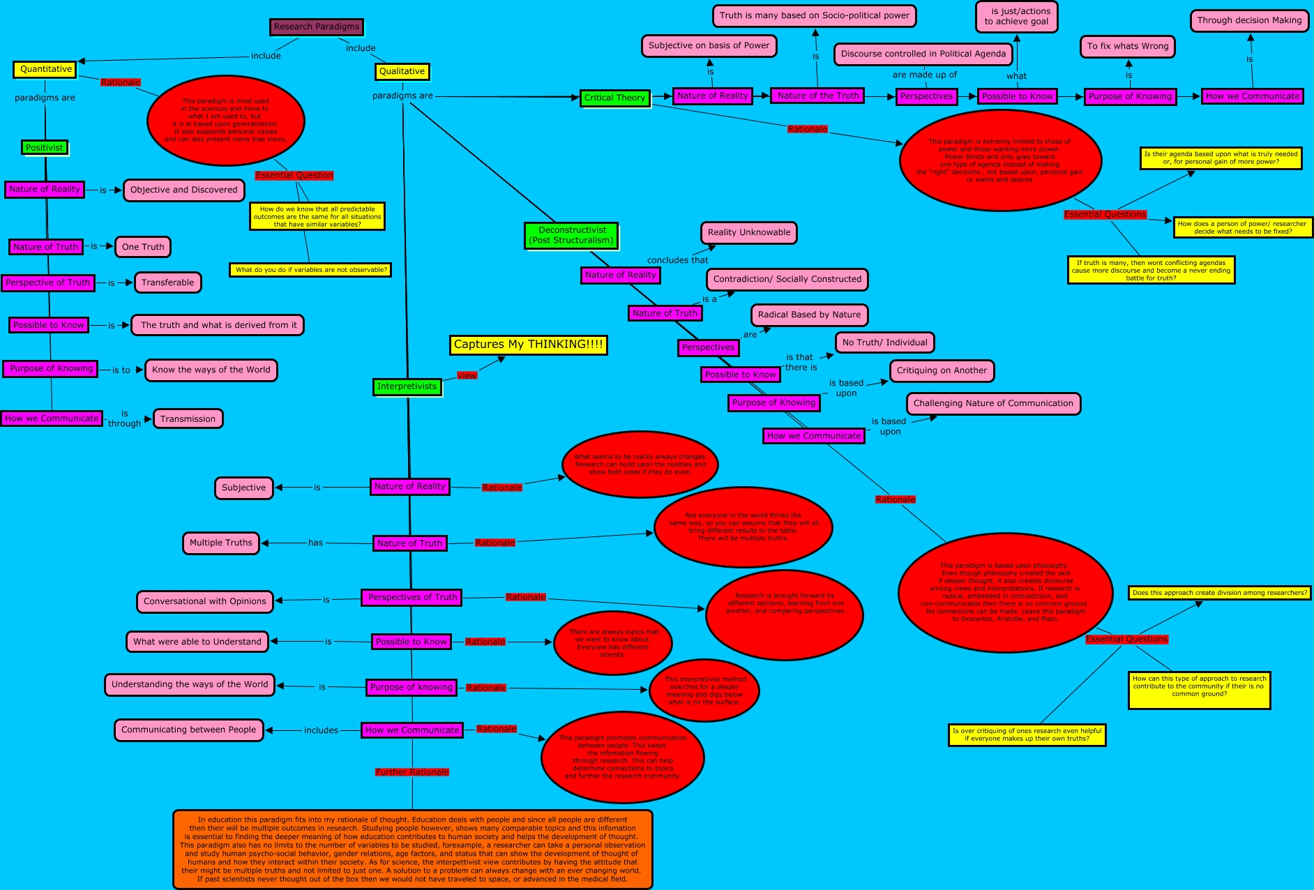 This Concept Map, created with IHMC CmapTools, has information related to: AWiles Research Paradigms, Quantitative paradigms are Nature of Reality, Quantitative Rationale This paradigm is most used in the sciences and more to what I am used to, but it is al based upon generalization. It also suspends personal values and can also present many bias views,, How we Communicate includes Communicating between People, Qualitative paradigms are Purpose of Knowing, Possible to Know is The truth and what is derived from it, This paradigm is extremly limited to those of power and those wanting more power. Power blinds and only goes toward one type of agenda instead of making the "right" decisions , not based upon, personal gain or wants and desires. Essential Questions Is their agenda based upon what is truly needed or, for personal gain of more power?, This paradigm is extremly limited to those of power and those wanting more power. Power blinds and only goes toward one type of agenda instead of making the "right" decisions , not based upon, personal gain or wants and desires. Essential Questions If truth is many, then wont conflicting agendas cause more discourse and become a never ending battle for truth?, Qualitative paradigms are Perspectives, Qualitative paradigms are Perspectives of Truth, Qualitative paradigms are Nature of Reality, Qualitative paradigms are Perspectives, Nature of Truth is One Truth, Qualitative paradigms are Nature of Truth, Quantitative paradigms are Possible to Know, Qualitative paradigms are Possible to Know, This paradigm is most used in the sciences and more to what I am used to, but it is al based upon generalization. It also suspends personal values and can also present many bias views, Essential Question How do we know that all predictable outcomes are the same for all situations that have similar variables?, Quantitative paradigms are Perspective of Truth, This paradigm is based upon philosophy. Even though philosophy created the skill if deeper thought, it also creates discourse among views and interpretations. If research is radical, embedded in contradiction, and non-communicable then there is no common ground. No connections can be made. Leave this paradigm to Descartes, Aristotle, and Plato. Essential Questions How can this type of approach to research contribute to the community if their is no common ground?, Purpose of Knowing is To fix whats Wrong, Qualitative paradigms are How we Communicate