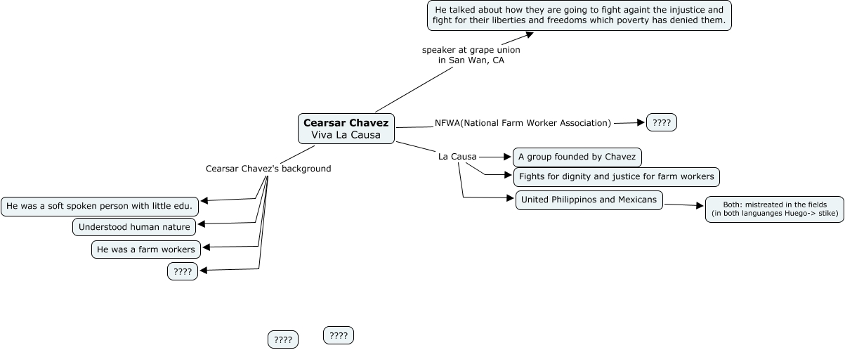 This Concept Map, created with IHMC CmapTools, has information related to: Chavez, United Philippinos and Mexicans Both: mistreated in the fields (in both languanges Huego-> stike), Cearsar Chavez Viva La Causa Cearsar Chavez's background ????, Cearsar Chavez Viva La Causa NFWA(National Farm Worker Association) ????, Cearsar Chavez Viva La Causa La Causa United Philippinos and Mexicans, Cearsar Chavez Viva La Causa Cearsar Chavez's background He was a soft spoken person with little edu., Cearsar Chavez Viva La Causa La Causa A group founded by Chavez, Cearsar Chavez Viva La Causa Cearsar Chavez's background Understood human nature, Cearsar Chavez Viva La Causa La Causa Fights for dignity and justice for farm workers, Cearsar Chavez Viva La Causa speaker at grape union in San Wan, CA He talked about how they are going to fight againt the injustice and fight for their liberties and freedoms which poverty has denied them., Cearsar Chavez Viva La Causa Cearsar Chavez's background He was a farm workers