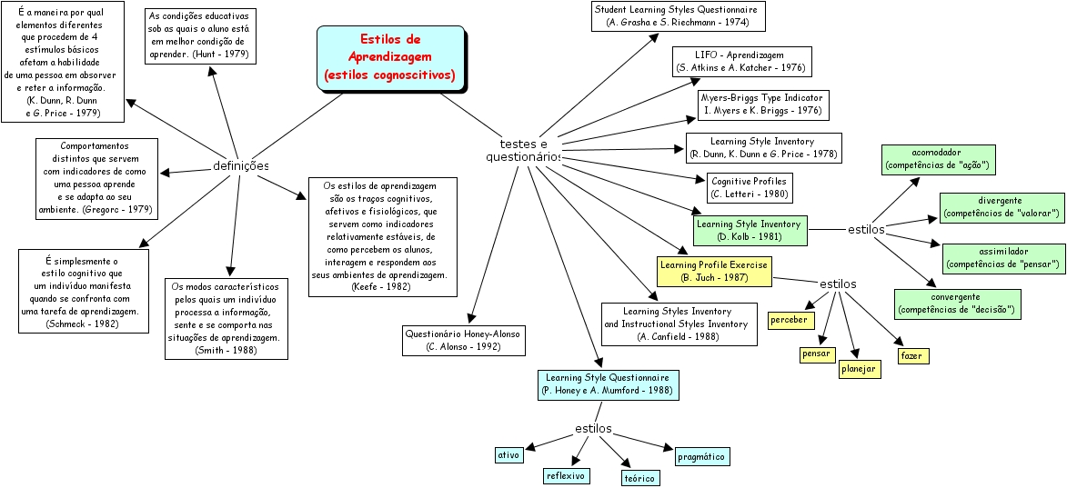 estilos de aprendizagem, learning style inventory (d. kolb - 1981), learning styles inventory and instructional styles inventory (a. canfield - 1988), cognitive profiles (c. letteri - 1980), learning style inventory (r. dunn, k. dunn e g. price - 1978), learning style questionnaire (p. honey e a. mumford - 1988), planejar, lifo - aprendizagem (s. atkins e a. katcher - 1976), assimilador (compet�ncias de pensar ), learning profile exercise (b. juch - 1987), comportamentos distintos que servem com indicadores de como uma pessoa aprende e se adapta ao seu ambiente. (gregorc - 1979), estilos de aprendizagem (estilos cognoscitivos), os modos caracter�sticos pelos quais um indiv�duo processa a informa��o, sente e se comporta nas situa��es de aprendizagem. (smith - 1988), � simplesmente o estilo cognitivo que um indiv�duo manifesta quando se confronta com uma tarefa de aprendizagem. (schmeck - 1982), pragm�tico, acomodador (compet�ncias de a��o ), pensar, os estilos de aprendizagem s�o os tra�os cognitivos, afetivos e fisiol�gicos, que servem como indicadores relativamente est�veis, de como percebem os alunos, interagem e respondem aos seus ambientes de aprendizagem. (keefe - 1982), perceber, ativo, question�rio honey-alonso (c. alonso - 1992), convergente (compet�ncias de decis�o ), � a maneira por qual elementos diferentes que procedem de 4 est�mulos b�sicos afetam a habilidade de uma pessoa em absorver e reter a informa��o. (k. dunn, r. dunn e g. price - 1979), te�rico, reflexivo, myers-briggs type indicator i. myers e k. briggs - 1976), divergente (compet�ncios de valorar ), student learning styles questionnaire (a. grasha e s. riechmann - 1974), as condi��es educativas sob as quais o aluno est� em melhor condi��o de aprender. (hunt - 1979), fazer