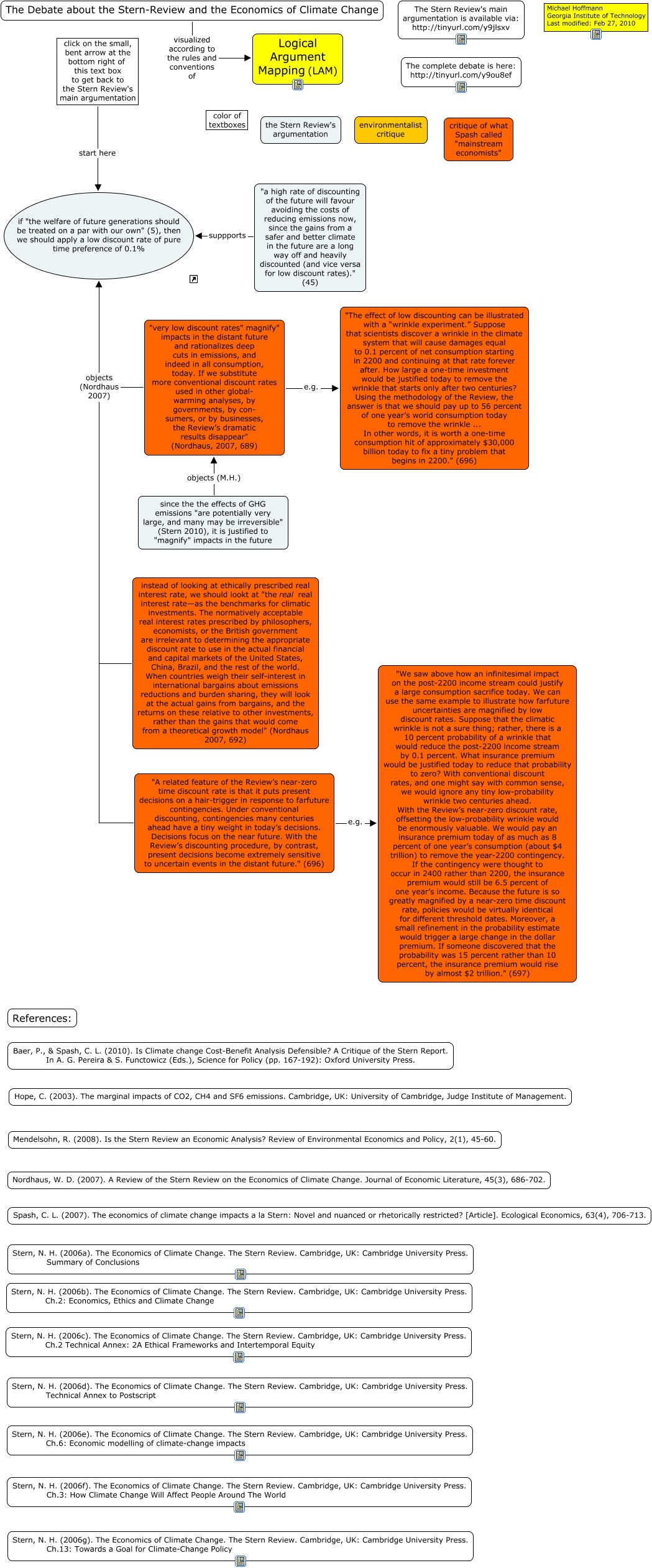 This Concept Map, created with IHMC CmapTools, has information related to: pure-time-preference, click on the small, bent arrow at the bottom right of this text box to get back to the Stern Review's main argumentation start here if "the welfare of future generations should be treated on a par with our own" (5), then we should apply a low discount rate of pure time preference of 0.1%, instead of looking at ethically prescribed real interest rate, we should lookt at "the real real interest rate—as the benchmarks for climatic investments. The normatively acceptable real interest rates prescribed by philosophers, economists, or the British government are irrelevant to determining the appropriate discount rate to use in the actual financial and capital markets of the United States, China, Brazil, and the rest of the world. When countries weigh their self-interest in international bargains about emissions reductions and burden sharing, they will look at the actual gains from bargains, and the returns on these relative to other investments, rather than the gains that would come from a theoretical growth model" (Nordhaus 2007, 692) objects (Nordhaus 2007) if "the welfare of future generations should be treated on a par with our own" (5), then we should apply a low discount rate of pure time preference of 0.1%, "very low discount rates" magnify" impacts in the distant future and rationalizes deep cuts in emissions, and indeed in all consumption, today. If we substitute more conventional discount rates used in other global- warming analyses, by governments, by con- sumers, or by businesses, the Review’s dramatic results disappear" (Nordhaus, 2007, 689) e.g. "The effect of low discounting can be illustrated with a “wrinkle experiment.�? Suppose that scientists discover a wrinkle in the climate system that will cause damages equal to 0.1 percent of net consumption starting in 2200 and continuing at that rate forever after. How large a one-time investment would be justified today to remove the wrinkle that starts only after two centuries? Using the methodology of the Review, the answer is that we should pay up to 56 percent of one year’s world consumption today to remove the wrinkle ... In other words, it is worth a one-time consumption hit of approximately $30,000 billion today to fix a tiny problem that begins in 2200." (696), since the the effects of GHG emissions "are potentially very large, and many may be irreversible" (Stern 2010), it is justified to "magnify" impacts in the future objects (M.H.) "very low discount rates" magnify" impacts in the distant future and rationalizes deep cuts in emissions, and indeed in all consumption, today. If we substitute more conventional discount rates used in other global- warming analyses, by governments, by con- sumers, or by businesses, the Review’s dramatic results disappear" (Nordhaus, 2007, 689), "a high rate of discounting of the future will favour avoiding the costs of reducing emissions now, since the gains from a safer and better climate in the future are a long way off and heavily discounted (and vice versa for low discount rates)." (45) suppports if "the welfare of future generations should be treated on a par with our own" (5), then we should apply a low discount rate of pure time preference of 0.1%, "A related feature of the Review’s near-zero time discount rate is that it puts present decisions on a hair-trigger in response to farfuture contingencies. Under conventional discounting, contingencies many centuries ahead have a tiny weight in today’s decisions. Decisions focus on the near future. With the Review’s discounting procedure, by contrast, present decisions become extremely sensitive to uncertain events in the distant future." (696) objects (Nordhaus 2007) if "the welfare of future generations should be treated on a par with our own" (5), then we should apply a low discount rate of pure time preference of 0.1%, "very low discount rates" magnify" impacts in the distant future and rationalizes deep cuts in emissions, and indeed in all consumption, today. If we substitute more conventional discount rates used in other global- warming analyses, by governments, by con- sumers, or by businesses, the Review’s dramatic results disappear" (Nordhaus, 2007, 689) objects (Nordhaus 2007) if "the welfare of future generations should be treated on a par with our own" (5), then we should apply a low discount rate of pure time preference of 0.1%, "A related feature of the Review’s near-zero time discount rate is that it puts present decisions on a hair-trigger in response to farfuture contingencies. Under conventional discounting, contingencies many centuries ahead have a tiny weight in today’s decisions. Decisions focus on the near future. With the Review’s discounting procedure, by contrast, present decisions become extremely sensitive to uncertain events in the distant future." (696) e.g. "We saw above how an infinitesimal impact on the post-2200 income stream could justify a large consumption sacrifice today. We can use the same example to illustrate how farfuture uncertainties are magnified by low discount rates. Suppose that the climatic wrinkle is not a sure thing; rather, there is a 10 percent probability of a wrinkle that would reduce the post-2200 income stream by 0.1 percent. What insurance premium would be justified today to reduce that probability to zero? With conventional discount rates, and one might say with common sense, we would ignore any tiny low-probability wrinkle two centuries ahead. With the Review’s near-zero discount rate, offsetting the low-probability wrinkle would be enormously valuable. We would pay an insurance premium today of as much as 8 percent of one year’s consumption (about $4 trillion) to remove the year-2200 contingency. If the contingency were thought to occur in 2400 rather than 2200, the insurance premium would still be 6.5 percent of one year’s income. Because the future is so g