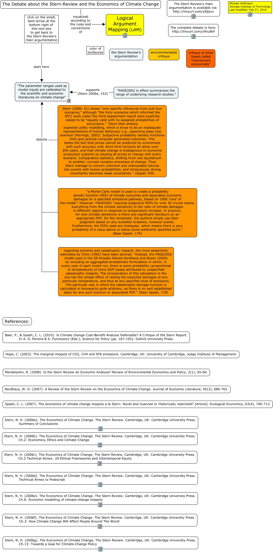This Concept Map, created with IHMC CmapTools, has information related to: Parameter-ranges, The Debate about the Stern-Review and the Economics of Climate Change visualized according to the rules and conventions of Logical Argument Mapping (LAM), click on the small, bent arrow at the bottom right of this text box to get back to the Stern Review's main argumentation start here "The parameter ranges used as model inputs are calibrated to the scientific and economic literatures on climate change", "PAGE2002 in effect summarises the range of underlying research studies." supports (Stern 2006e, 153) "The parameter ranges used as model inputs are calibrated to the scientific and economic literatures on climate change", Stern (2006: 61) draws "very specific inferences from just four scenarios," although "the forty scenarios which informed the IPCC work under the third assessment report were explicitly stated to be “equally valid with no assigned probabilities of occurrence.�? "Stern then employ expected utility modelling, which is know to be an inadequate representations of human behaviour e.g., assuming away loss aversion (Perrings, 2003). Subjective probability density functions then give precise computer generated outcomes. This belies the fact that prices cannot be predicted by economists with such accuracy over short time horizons let alone over 200 years, and that climate change is endogenous to economic production systems so causing all prices to change with every scenario. Comparative statistics, shifting from one equilibrium to another, conceal complex processes of change. Thus Stern manage to convert unknown and unknowable futures into events with known probabilities, and miraculously strong uncertainty becomes weak uncertainty." (Spash 709) objects "The parameter ranges used as model inputs are calibrated to the scientific and economic literatures on climate change", regarding extreme and catastrophic impacts, the more pessimistic estimates by Cline (1992) have been ignored. "Instead, the PAGE2002 model used in the SR broadly follows Nordhaus and Boyer (2000) by including an aggregated probabilistic formulation in which, in every year of each model run, there is some probability (proportional to temperature) of extra GDP losses attributed to unspecified catastrophic impacts. The incorporation of this calculation in the end has the simple effect of raising the expected damages at any particular temperature, and thus at any specified level of emissions. The particular way in which the catastrophic damage function is calculated is necessarily quite arbitrary, as there is no well established basis for any such function or associated PDF." (Baer-Spash, 178) objects "The parameter ranges used as model inputs are calibrated to the scientific and economic literatures on climate change", "a Monte Carlo model is used to create a probability density function (PDF) of climate outcomes and associated economic damages for a specified emissions pathway, based on 1000 ‘runs’ of the model." However, PAGE2002 "requires subjective PDFs for over 30 crucial inputs, everything from the climate sensitivity to the ratio of climate damages in different regions in response to temperature increase. In practice, for only climate sensitivity is there any significant literature on an appropriate PDF; for the remainder, the authors simply use their judgment based on any available evidence, however scanty. Furthermore, the PDFs used are triangular, which means there is zero probability of a value above or below some arbitrarily specified point." (Baer-Spash, 176) objects "The parameter ranges used as model inputs are calibrated to the scientific and economic literatures on climate change"