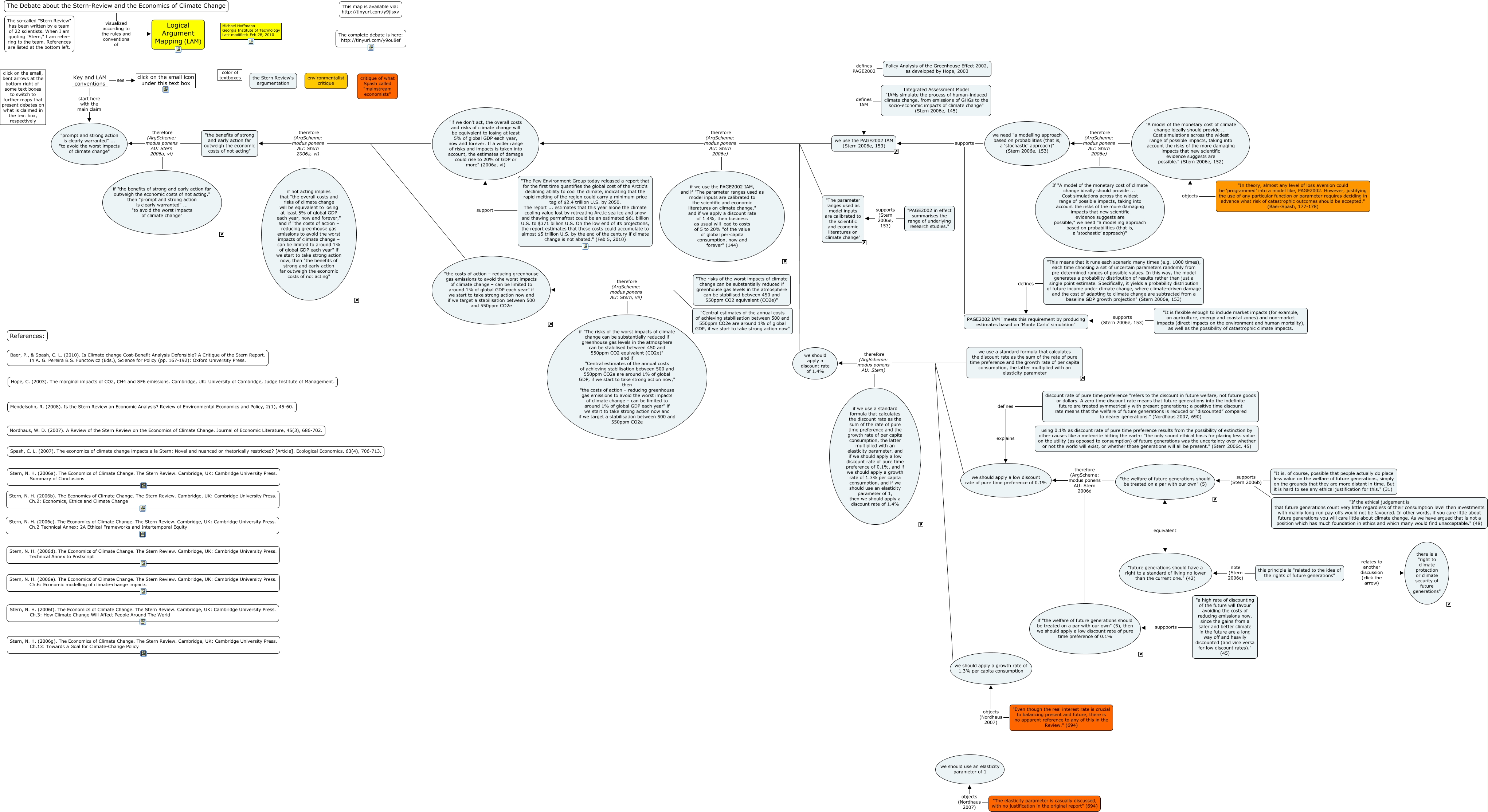 This Concept Map, created with IHMC CmapTools, has information related to: Debate-Stern-review-Climate-economics, we should apply a growth rate of 1.3% per capita consumption therefore (ArgScheme: modus ponens AU: Stern) we should apply a discount rate of 1.4%, "The risks of the worst impacts of climate change can be substantially reduced if greenhouse gas levels in the atmosphere can be stabilised between 450 and 550ppm CO2 equivalent (CO2e)" therefore (ArgScheme: modus ponens AU: Stern, vii) "the costs of action – reducing greenhouse gas emissions to avoid the worst impacts of climate change – can be limited to around 1% of global GDP each year" if we start to take strong action now and if we target a stabilisation between 500 and 550ppm CO2e, "The elasticity parameter is casually discussed, with no justification in the original report" (694) objects (Nordhaus 2007) we should use an elasticity parameter of 1, "PAGE2002 in effect summarises the range of underlying research studies." supports (Stern 2006e, 153) "The parameter ranges used as model inputs are calibrated to the scientific and economic literatures on climate change", if not acting implies that "the overall costs and risks of climate change will be equivalent to losing at least 5% of global GDP each year, now and forever," and if "the costs of action – reducing greenhouse gas emissions to avoid the worst impacts of climate change – can be limited to around 1% of global GDP each year" if we start to take strong action now, then "the benefits of strong and early action far outweigh the economic costs of not acting" therefore (ArgScheme: modus ponens AU: Stern 2006a, vi) "the benefits of strong and early action far outweigh the economic costs of not acting", we use the PAGE2002 IAM (Stern 2006e, 153) therefore (ArgScheme: modus ponens AU: Stern 2006e) "if we don't act, the overall costs and risks of climate change will be equivalent to losing at least 5% of global GDP each year, now and forever. If a wider range of risks and impacts is taken into account, the estimates of damage could rise to 20% of GDP or more" (2006a, vi), this principle is "related to the idea of the rights of future generations" note (Stern 2006c) "future generations should have a right to a standard of living no lower than the current one." (42), Key and LAM conventions see click on the small icon under this text box, PAGE2002 IAM "meets this requirement by producing estimates based on ‘Monte Carlo’ simulation" supports we use the PAGE2002 IAM (Stern 2006e, 153), "It is, of course, possible that people actually do place less value on the welfare of future generations, simply on the grounds that they are more distant in time. But it is hard to see any ethical justification for this." (31) supports (Stern 2006b) "the welfare of future generations should be treated on a par with our own" (5), "Central estimates of the annual costs of achieving stabilisation between 500 and 550ppm CO2e are around 1% of global GDP, if we start to take strong action now" therefore (ArgScheme: modus ponens AU: Stern, vii) "the costs of action – reducing greenhouse gas emissions to avoid the worst impacts of climate change – can be limited to around 1% of global GDP each year" if we start to take strong action now and if we target a stabilisation between 500 and 550ppm CO2e, if "the benefits of strong and early action far outweigh the economic costs of not acting," then "prompt and strong action is clearly warranted" ... "to avoid the worst impacts of climate change" therefore (ArgScheme: modus ponens AU: Stern 2006a, vi) "prompt and strong action is clearly warranted" ... "to avoid the worst impacts of climate change", if "the welfare of future generations should be treated on a par with our own" (5), then we should apply a low discount rate of pure time preference of 0.1% therefore (ArgScheme: modus ponens AU: Stern 2006d we should apply a low discount rate of pure time preference of 0.1%, we should use an elasticity parameter of 1 therefore (ArgScheme: modus ponens AU: Stern) we should apply a discount rate of 1.4%, Key and LAM conventions start here with the main claim "prompt and strong action is clearly warranted" ... "to avoid the worst impacts of climate change", we need "a modelling approach based on probabilities (that is, a ‘stochastic’ approach)" (Stern 2006e, 153) supports we use the PAGE2002 IAM (Stern 2006e, 153), "This means that it runs each scenario many times (e.g. 1000 times), each time choosing a set of uncertain parameters randomly from pre-determined ranges of possible values. In this way, the model generates a probability distribution of results rather than just a single point estimate. Specifically, it yields a probability distribution of future income under climate change, where climate-driven damage and the cost of adapting to climate change are subtracted from a baseline GDP growth projection" (Stern 2006e, 153) defines PAGE2002 IAM "meets this requirement by producing estimates based on ‘Monte Carlo’ simulation", "Even though the real interest rate is crucial to balancing present and future, there is no apparent reference to any of this in the Review." (694) objects (Nordhaus 2007) we should apply a growth rate of 1.3% per capita consumption, "if we don't act, the overall costs and risks of climate change will be equivalent to losing at least 5% of global GDP each year, now and forever. If a wider range of risks and impacts is taken into account, the estimates of damage could rise to 20% of GDP or more" (2006a, vi) therefore (ArgScheme: modus ponens AU: Stern 2006a, vi) "the benefits of strong and early action far outweigh the economic costs of not acting", we should apply a discount rate of 1.4% therefore (ArgScheme: modus ponens AU: Stern 2006e) "if we don't act, the overall costs and risks of climate change will be equivalent to losing at least 5% of global GDP each year, now and forever. If a wider range of risks and impacts 