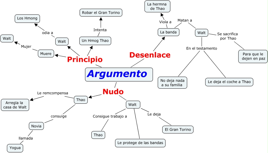Este Cmap, tiene información relacionada con: Argumento, Walt Le deja El Gran Torino, Novia llamada Yogua, Walt Consigue trabajo a Thao, Walt En el testamento No deja nada a su familia, Argumento Nudo Walt, Argumento Nudo Thao, Argumento Principio Walt, Argumento Principio Un Hmog Thao, Un Hmog Thao Intenta Robar el Gran Torino, Argumento Desenlace La banda, Thao Le remcompensa Arregla la casa de Walt, Walt Se sacrifica por Thao Para que le dejen en paz, La banda Matan a Walt, La banda Viola a La hermna de Thao, Walt ???? Le protege de las bandas, Walt odia a Los Hmong, Muere Mujer Walt, Argumento Principio Muere, Walt En el testamento Le deja el coche a Thao, Thao consuige Novia