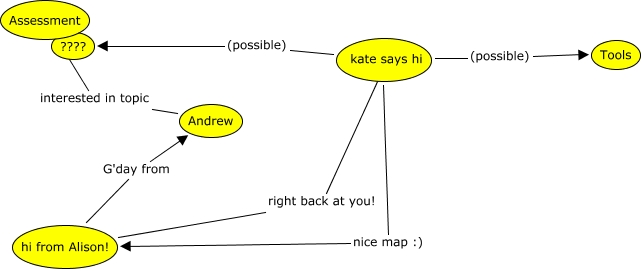 This Concept Map, created with IHMC CmapTools, has information related to: Intro, kate says hi (possible) Tools, kate says hi nice map :) hi from Alison!, hi from Alison! G'day from Andrew, kate says hi (possible) ????, Andrew interested in topic Assessment