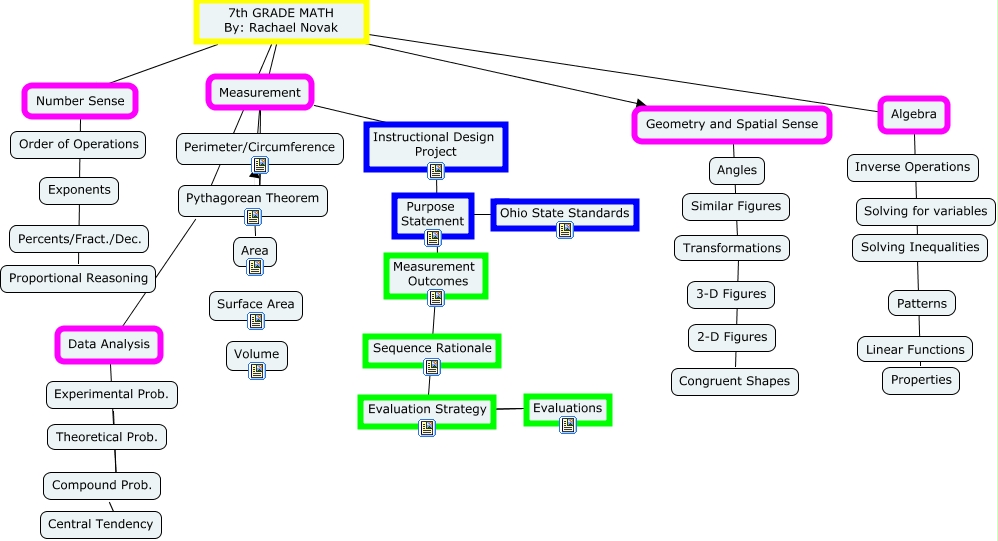 This Concept Map, created with IHMC CmapTools, has information related to: rnovak. Instructional Design Project EDTL 7100, Measurement Area, Purpose Statement Ohio State Standards, Perimeter/Circumference ???? Measurement, Measurement ???? Instructional Design Project, 7th GRADE MATH By: Rachael Novak Number Sense, 7th GRADE MATH By: Rachael Novak ???? Data Analysis, Geometry and Spatial Sense ???? Congruent Shapes, 7th GRADE MATH By: Rachael Novak Includes Measurement, Algebra ???? Properties, Instructional Design Project ???? Evaluation Strategy, Data Analysis ???? Experimental Prob., Compound Prob. ???? Central Tendency, Evaluation Strategy ???? Evaluations, Measurement Perimeter/Circumference, Algebra ???? 7th GRADE MATH By: Rachael Novak, Number Sense ???? Proportional Reasoning, 7th GRADE MATH By: Rachael Novak Geometry and Spatial Sense, Evaluation Strategy ???? Evaluations